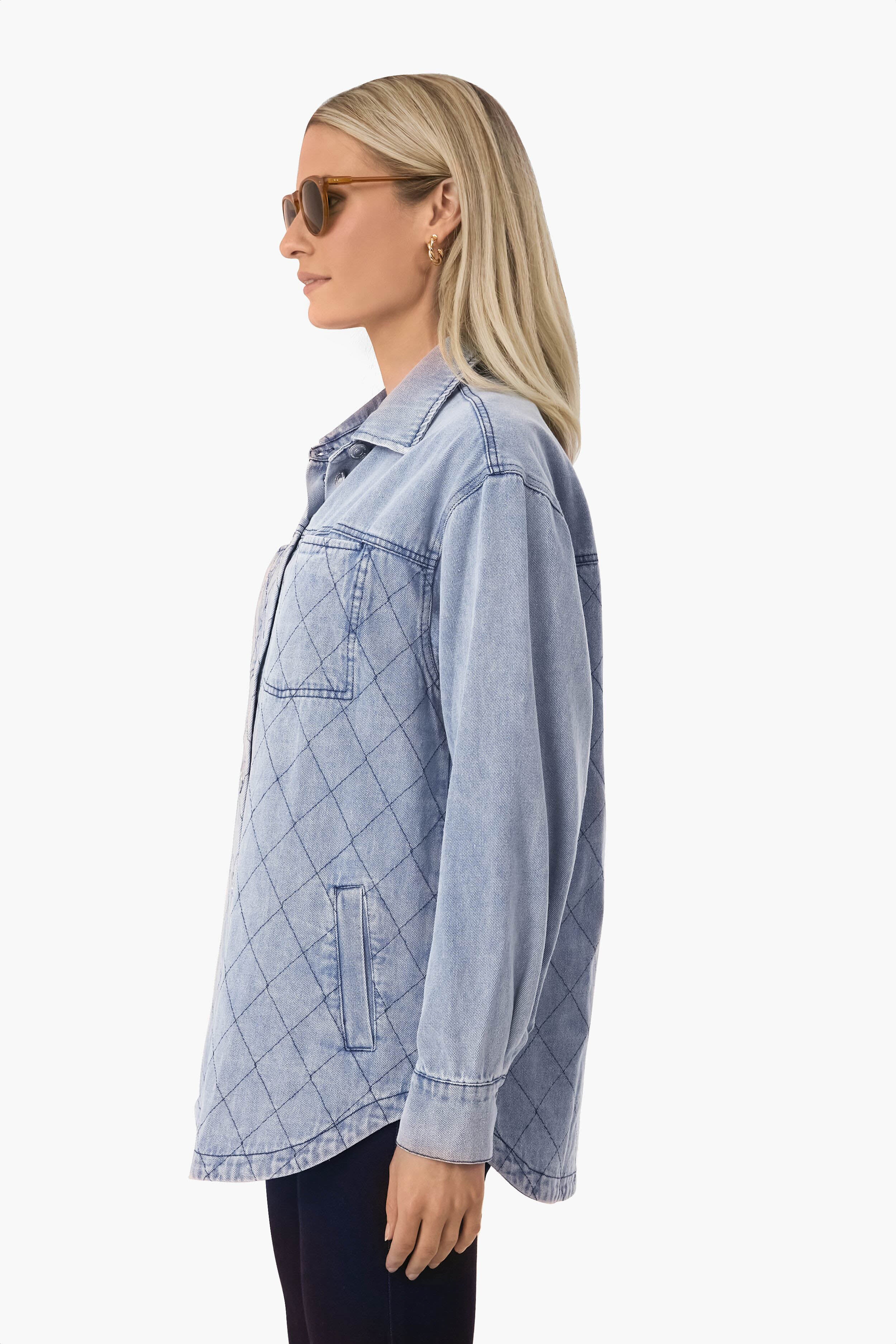 The Oversized Lennon Shacket is a quilted denim shirt-jacket hybrid in a roomy cut for easy layering. With a spread collar. a uniquely textured finish. and plenty of pockets to hold all of your essentials. this is a fun piece of outerwear which can be styled with a number of versatile outfits. Throw this on as you head out the door for an effortlessly cool look to walk around and enjoy the fall weather.
