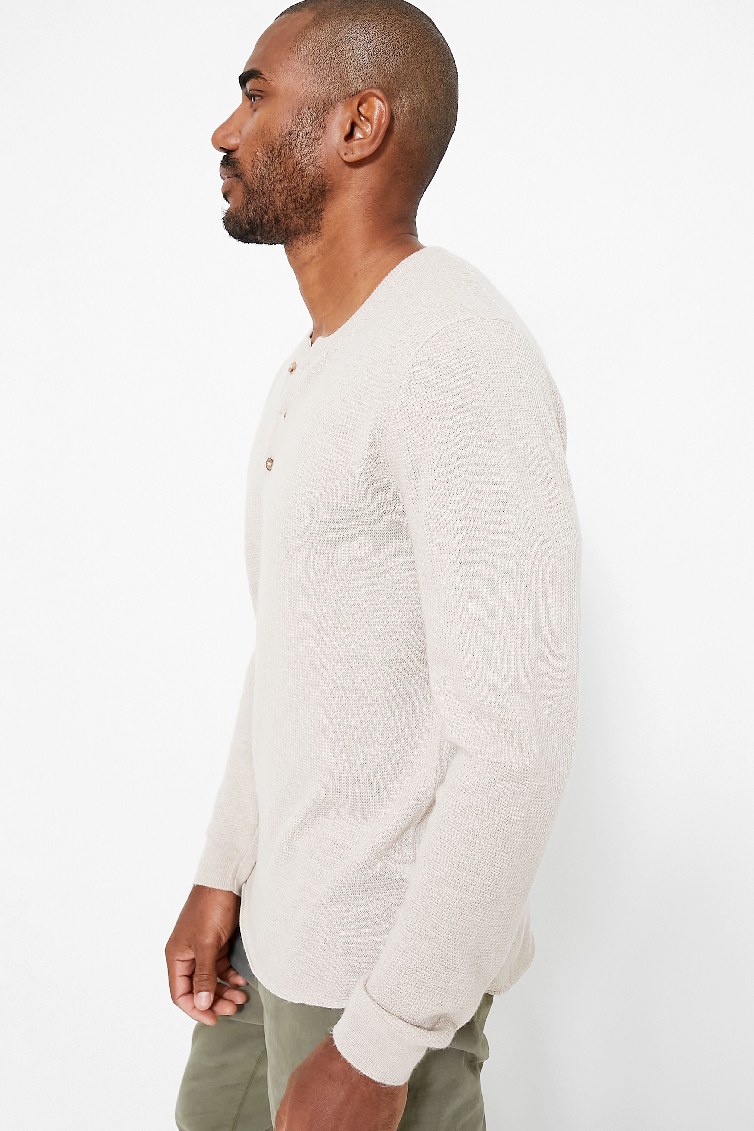The Oyster Midweight Sweater Henley is one of our favorite sustainably-made closet essentials! Beautifully crafted in extra warm merino wool from Spain blended with recycled polyester. this top is soft. durable. and the perfect transitional piece you need. Featuring a round neckline and partial front button placket. this relaxed silhouette is great for layering and everyday adventures. Style with denim. a jacket. and sneakers for weekend wear or watching the kids at soccer practice.