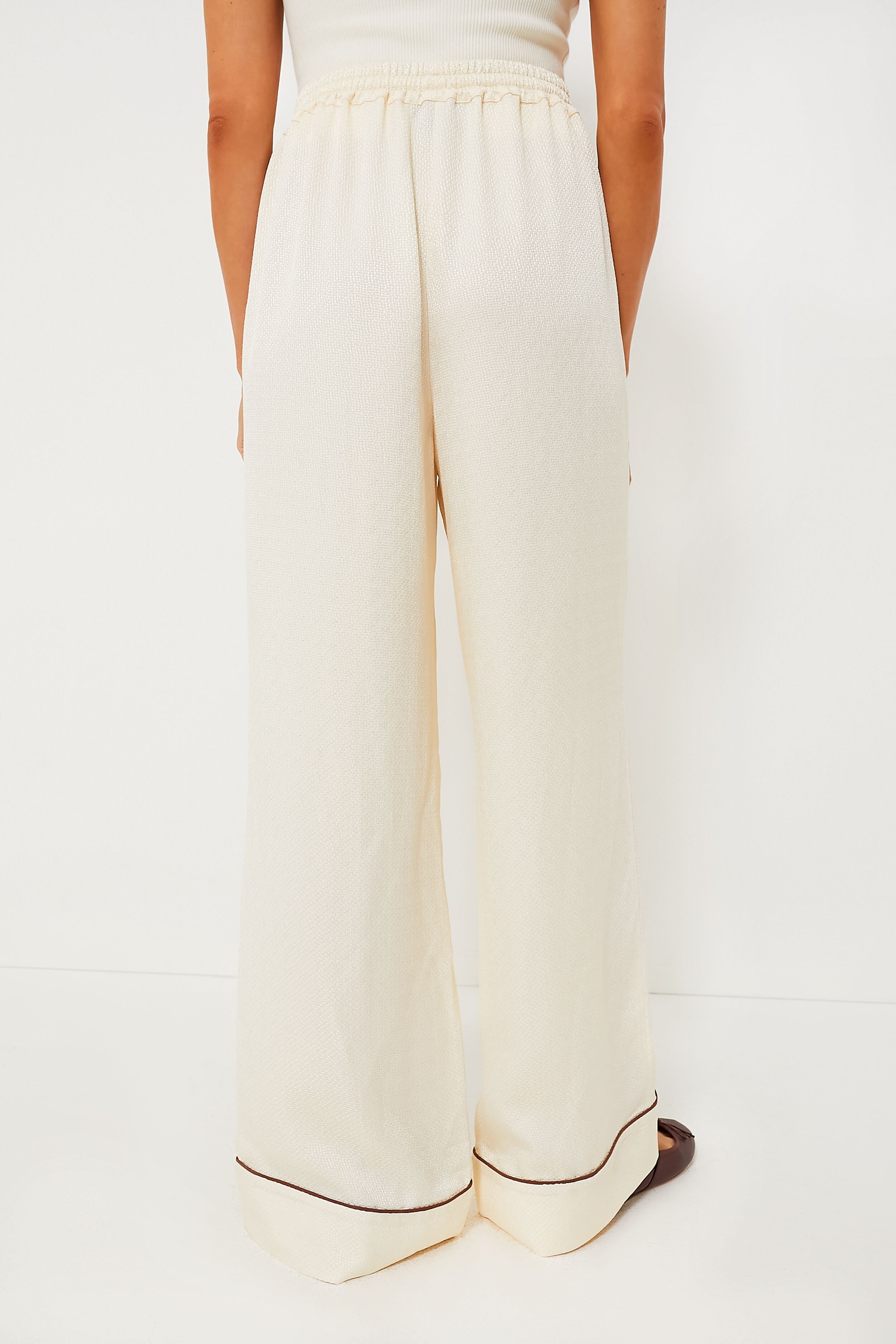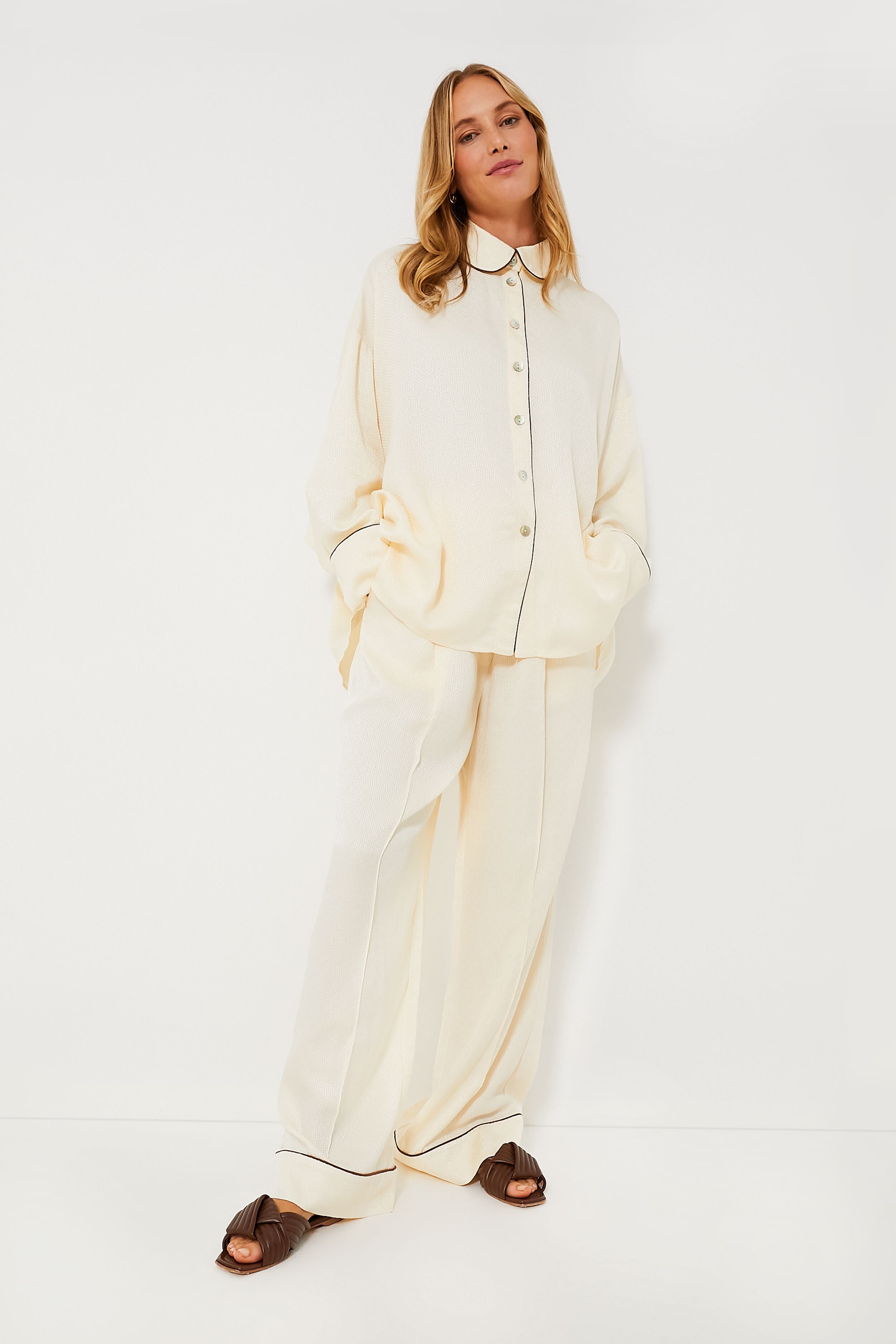 Keep cool while you sleep this season with the stunning Pearl Pastelle Oversized Jaccard Pants. crafted in soft premium jacquard with a woven texture and subtle sheen. The contrast piping and vertical stitching add an element of sophistication while the elasticated waistband and loose fit mean ultimate comfort when it's time to count those sheep. Wear with the Pastelle Oversized Jacquard Shirt for a matching set.