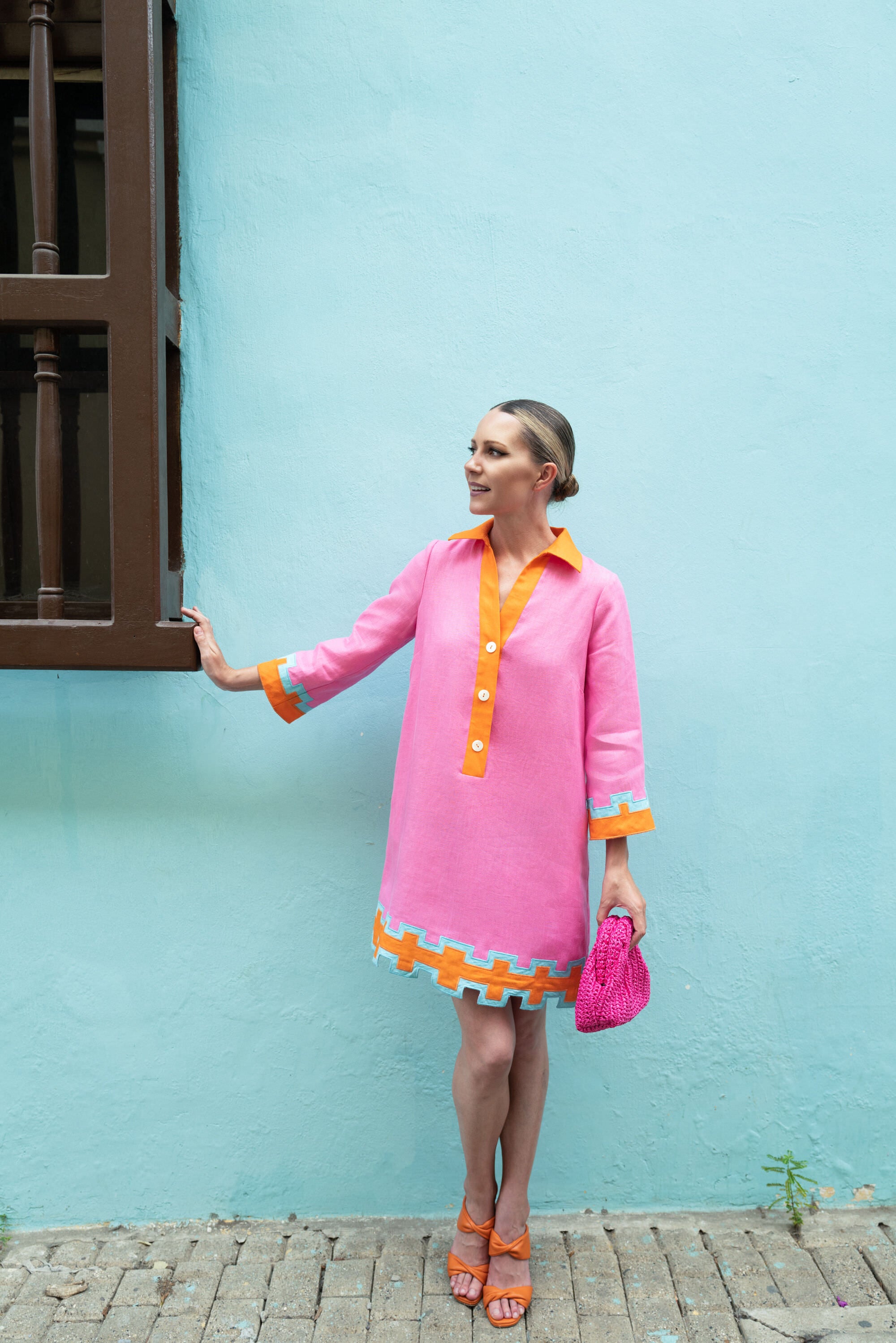 Our best-selling Collier Dress was updated with a beautiful geometric placed trim that is inspired by the old school glamour of scallop trim pagoda-style umbrellas. Crafted from 100% linen. this easy breezy mini flatters and flows in all the right places.