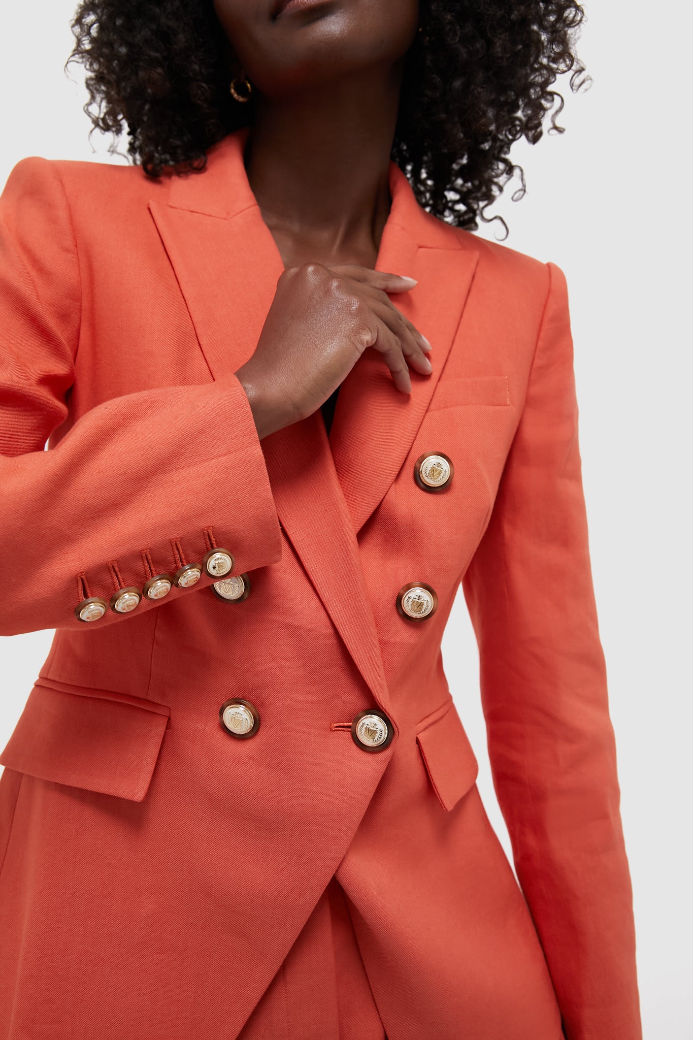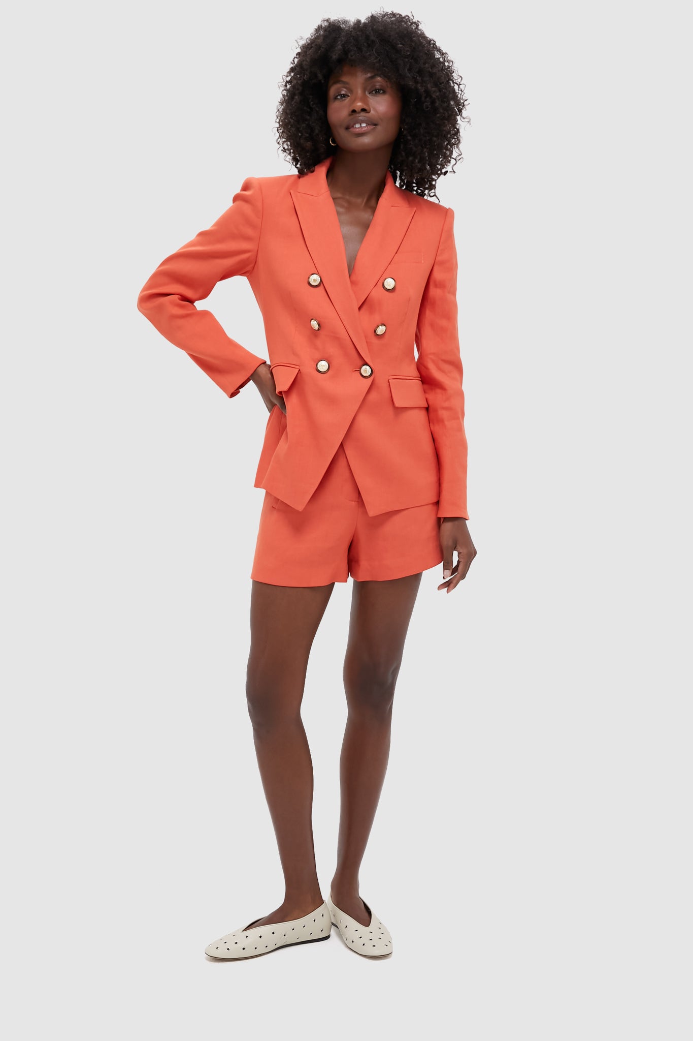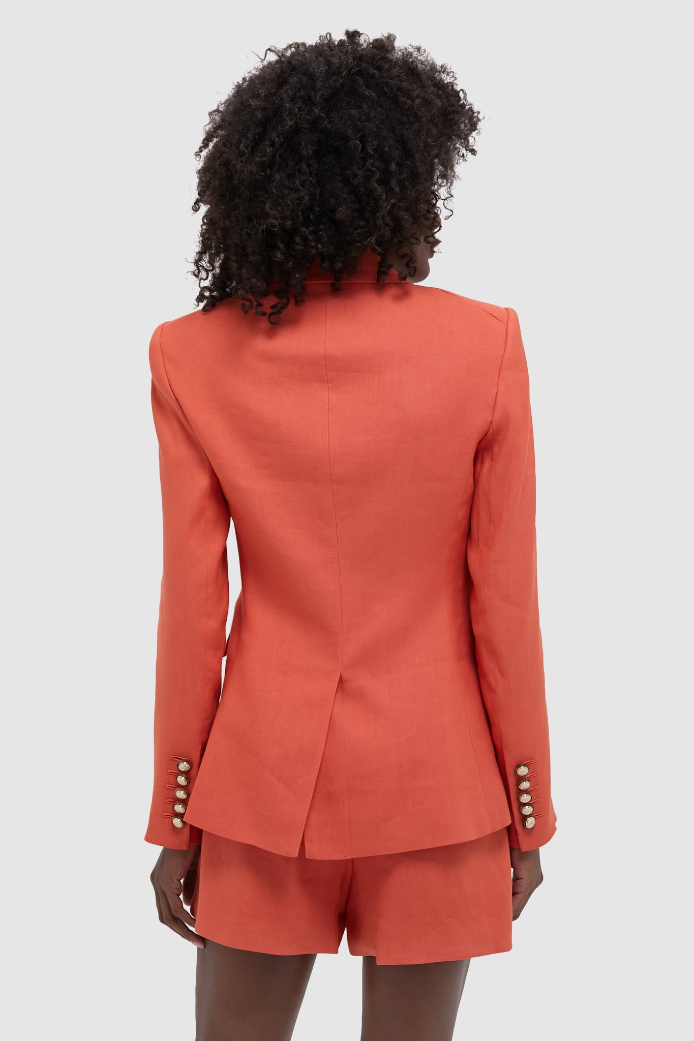 The Persimmon Miller Dickey Jacket. now in Italian stretch linen. has everything you love about this classic blazer in a fun and bright color. From the precision tailoring. slim and flattering fit. and gold button detailing. pair this jacket with the matching Persimmon Jazmin Short. flats or heels. and your go to bag for a chic look for work or play!