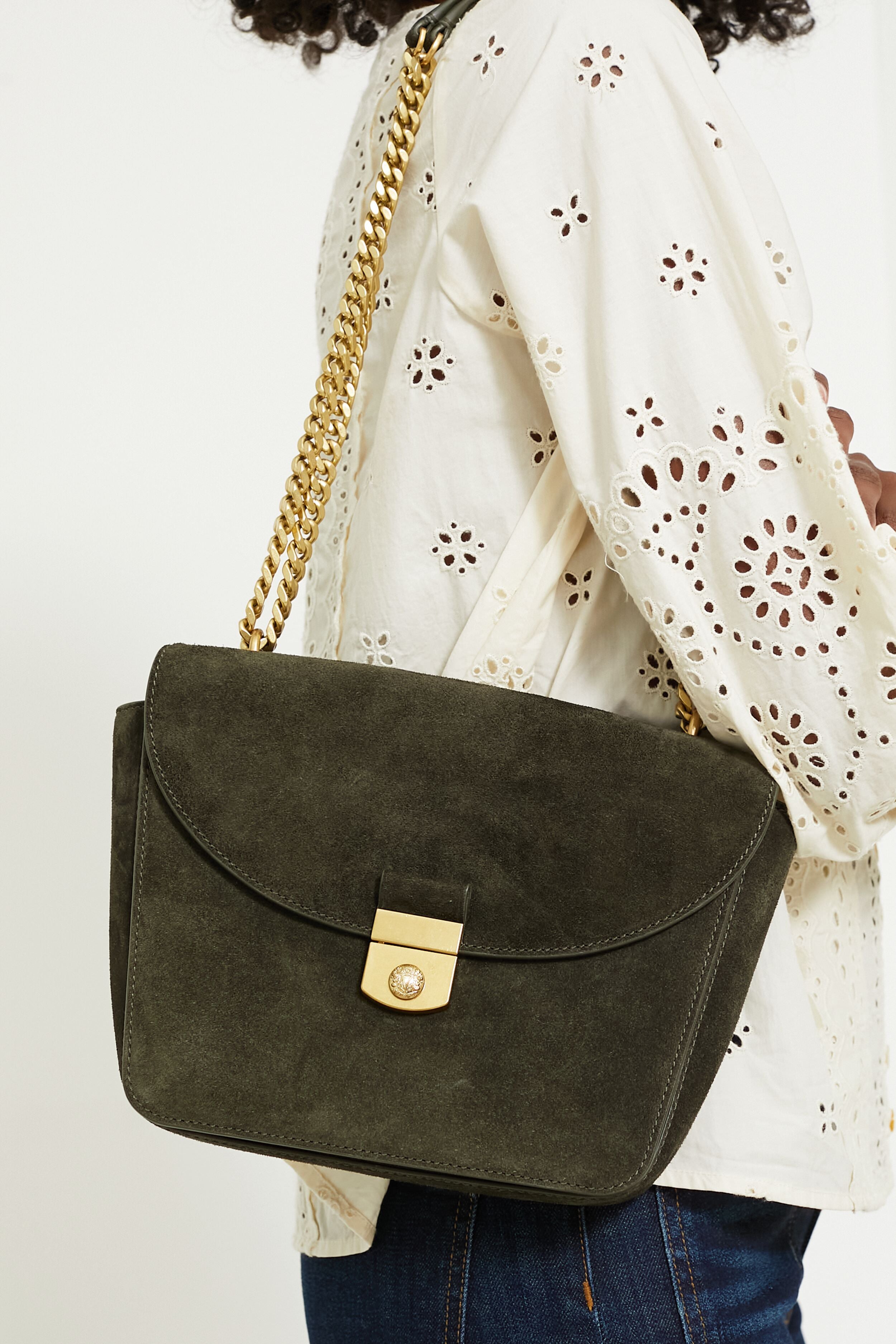 Defined by its chic. sculptural silhouette. the Pine Double Link Flap Bag is a cool classic for years to come. Crafted from soft Italian suede and finished with sleek hardware. including its crest-engraved lock closure. Interior slip and zip pockets—plus an exterior back pocket—ensures organization while the gold chain-link strap adds glamorous edge. Use it for market hauls. the office. or your next trip to the countryside.– you get the idea– versatile in style and function. this bag is working overtime to get the job done.