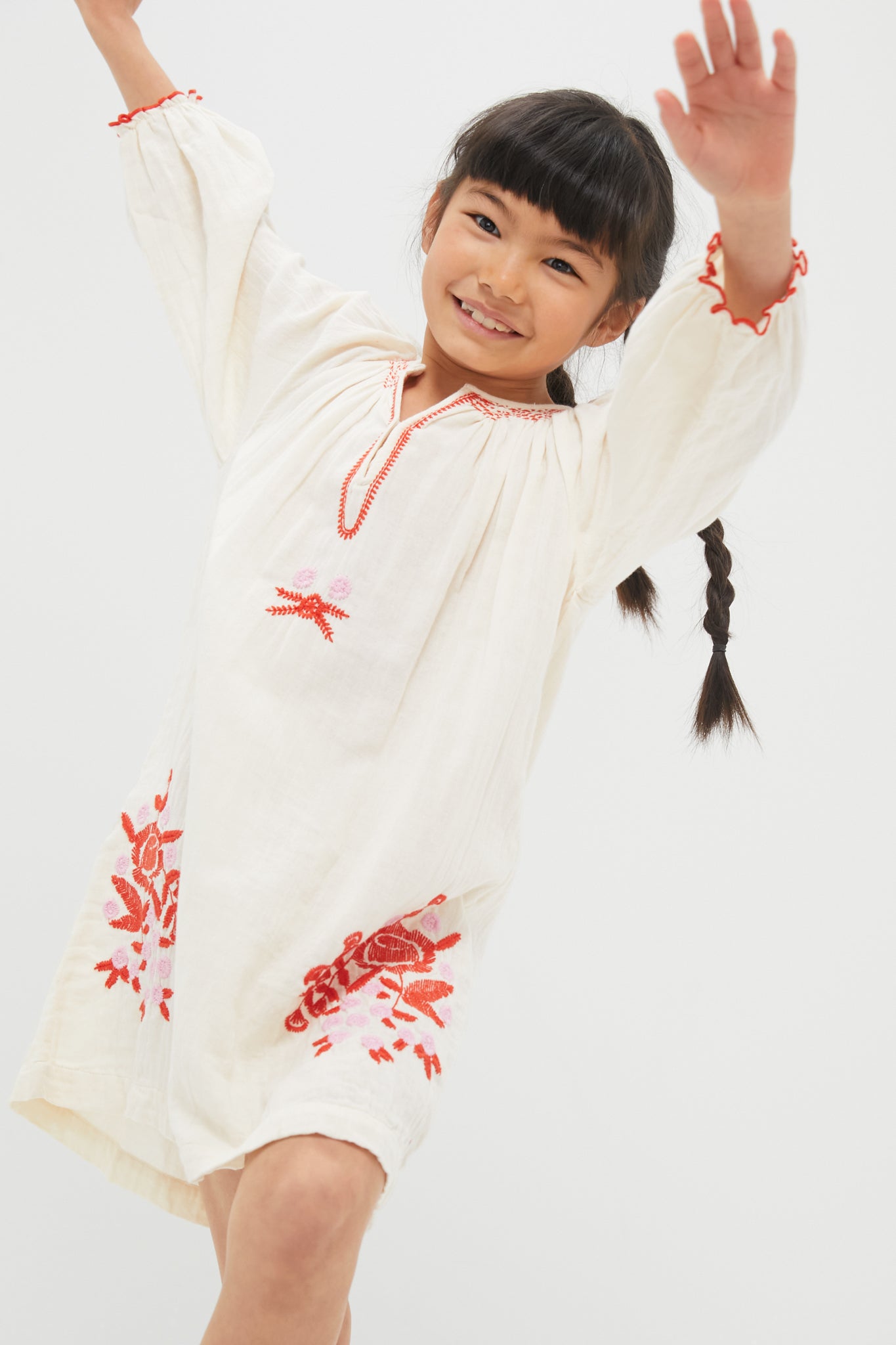The Pink and Orange Ava Dress features strawberry cream embroidery. for a boho chic vibe. This versatile frock includes gathered sleeves and a subtle v-neck. Pair with a sandal or a comfy sneaker for a perfect school day or weekend look.