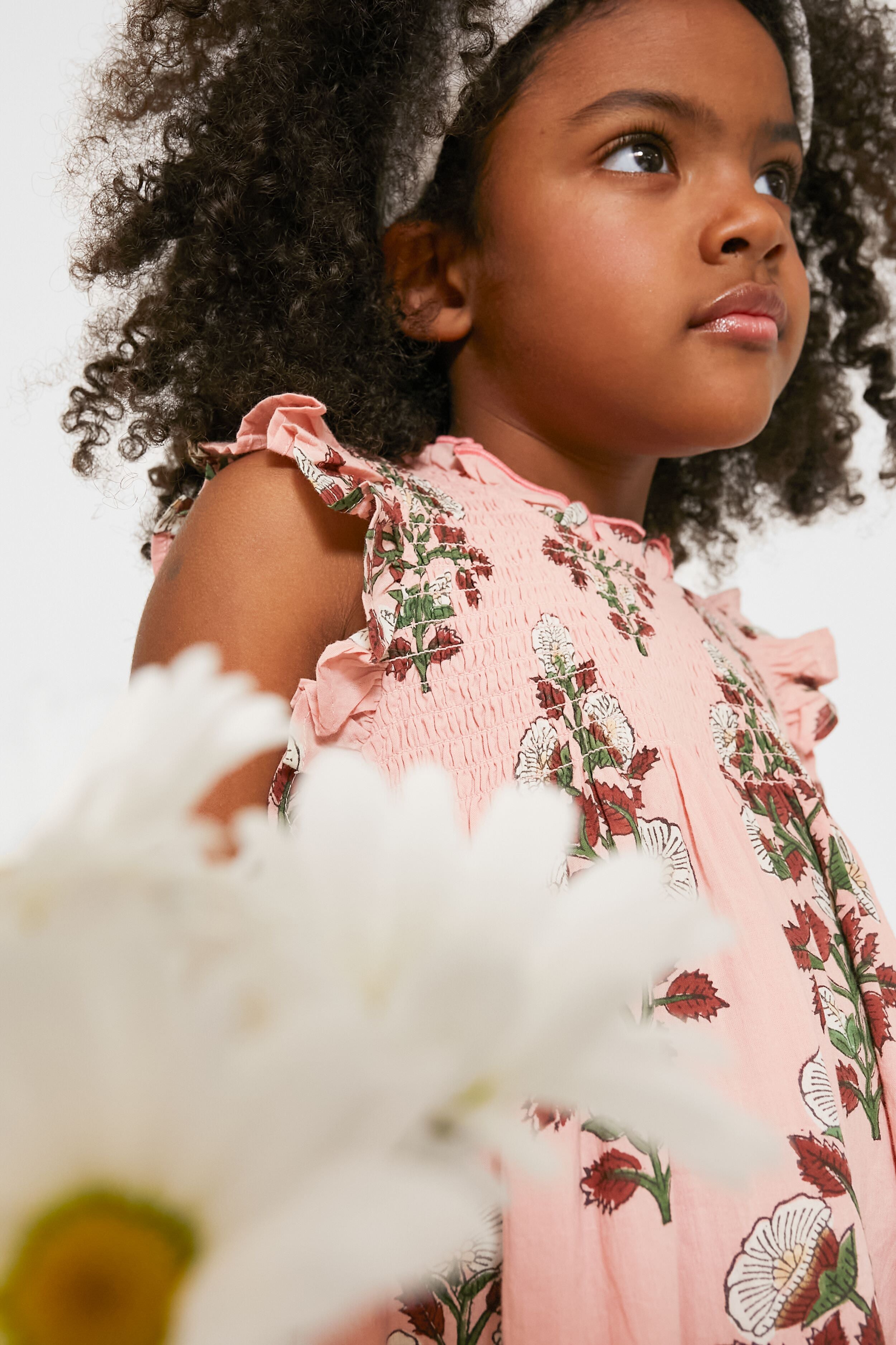 Pretty in Pink! Your little girl is about to look absolutely adorable in the Bouquet Floral Stevie Dress. A gorgeous spray of white blooms on a vibrant vine pops off the dusty pink ground. this flock favorite features a ruffle at the neckline and arm. smocking at the chest and an invisible zipper at back. Pair with a headband for Sunday brunches or picture day at school. and wear it with sandals for fun in the sun.