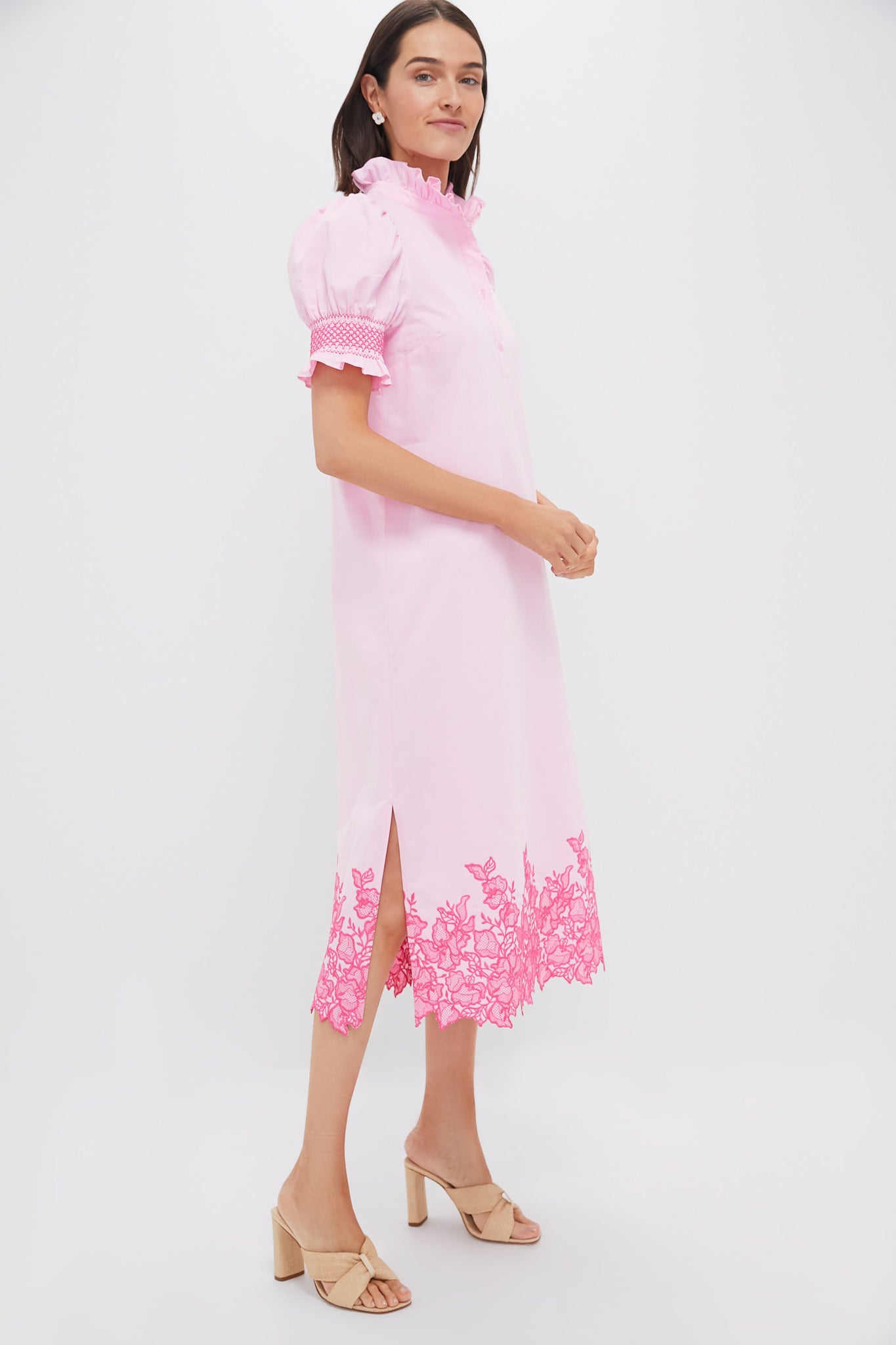 A chic. sophisticated style. we are loving the Pink Embroidery Eliza Midi Dress. Boasting a stand ruffle collar. short puff sleeves with an elastic smocked cuff. and intricate embroidery along the hem. this midi is easy yet elevated. Pair with white sneakers for running around town. or with sandals for a brunch date.
