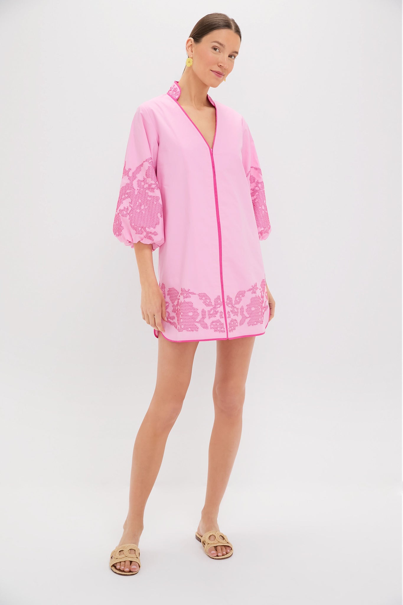 The perfect blend of ease and style. the Arem Caftan is a style you'll reach for time and time again this season. Featuring a pink print and chic caftan silhouette. we're wearing this mini on our next vacation or al-fresco dinner party. Pair with timeless leather sandals and a raffia clutch for a bohemian inspired look!