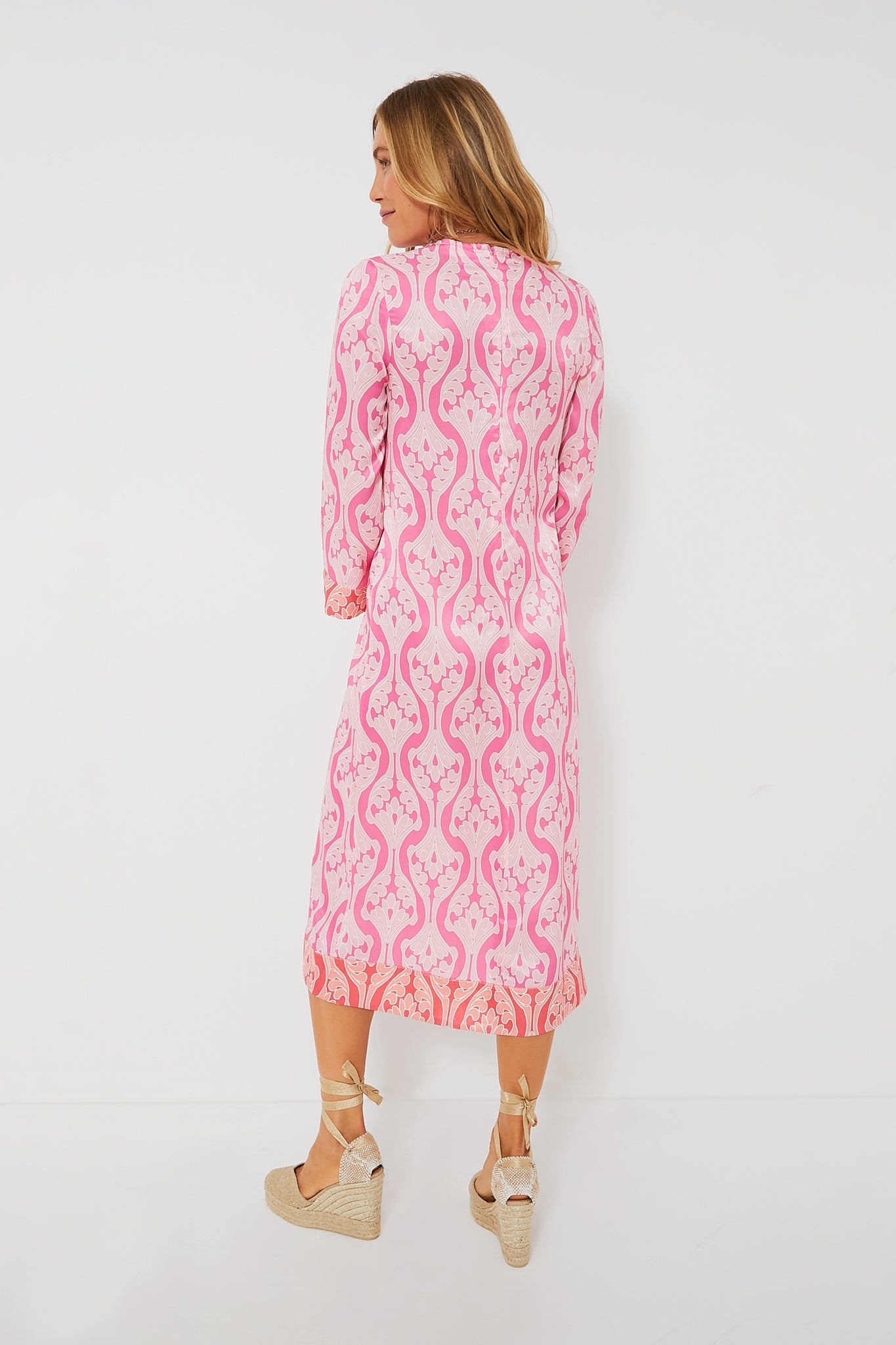 Pretty in Pink! The Hayes Dress is an understated stunner that deserves a spot in your closet. Done in an exclusive soft and silky geometric print. this midi features a crewneck with contrast print on cuff and hem. A true classic. this silhouette can work for every occasion and every body type. so it is no surprise that it has become our go-to for everything from cocktails with friends to warm-weather vacations to sea side weddings. Add strappy sandals and statement accessories for chic feminine look at all your RSVPs this season.