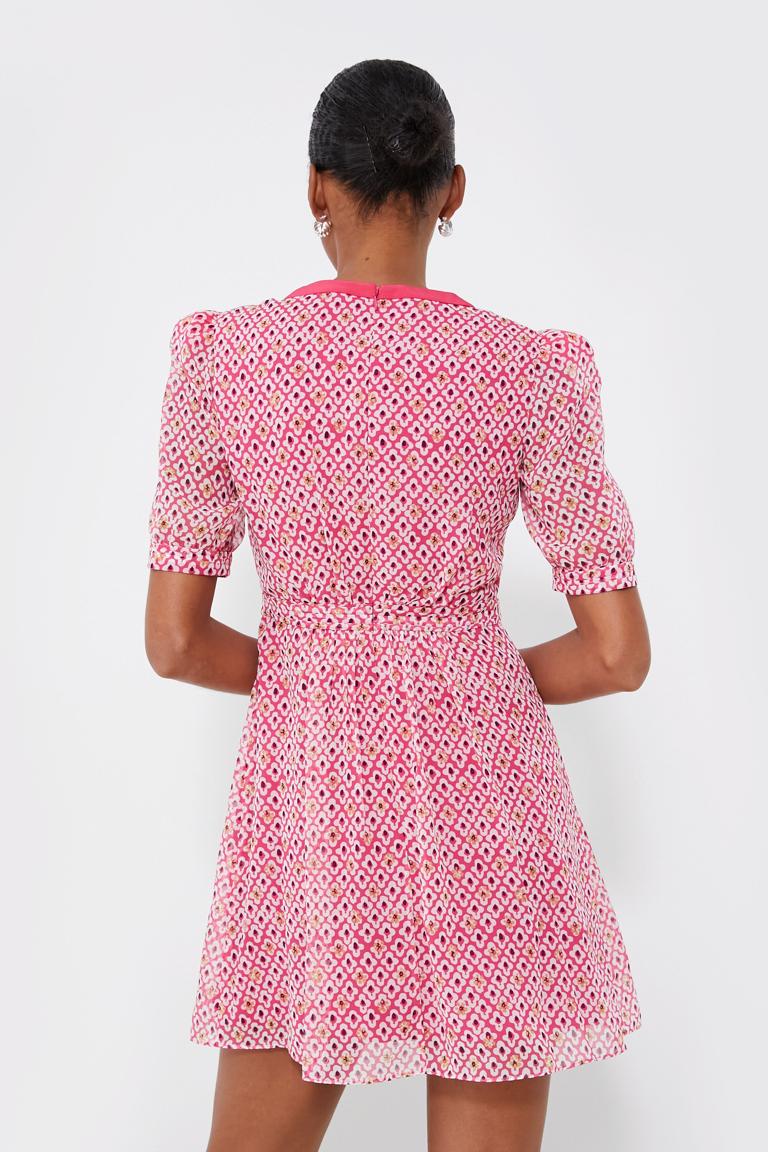 The Jamie Dress embodies the ultimate flirty frock. Sweet and sassy. this mini features keyhole chest cut-outs with bead-embellished bow detailing and boasts a painterly monogrammed pink Indian block-print. Full of personality. this beauty is perfect for a girls night out or your next event. Style with pumps and a metallic clutch for the perfect look!