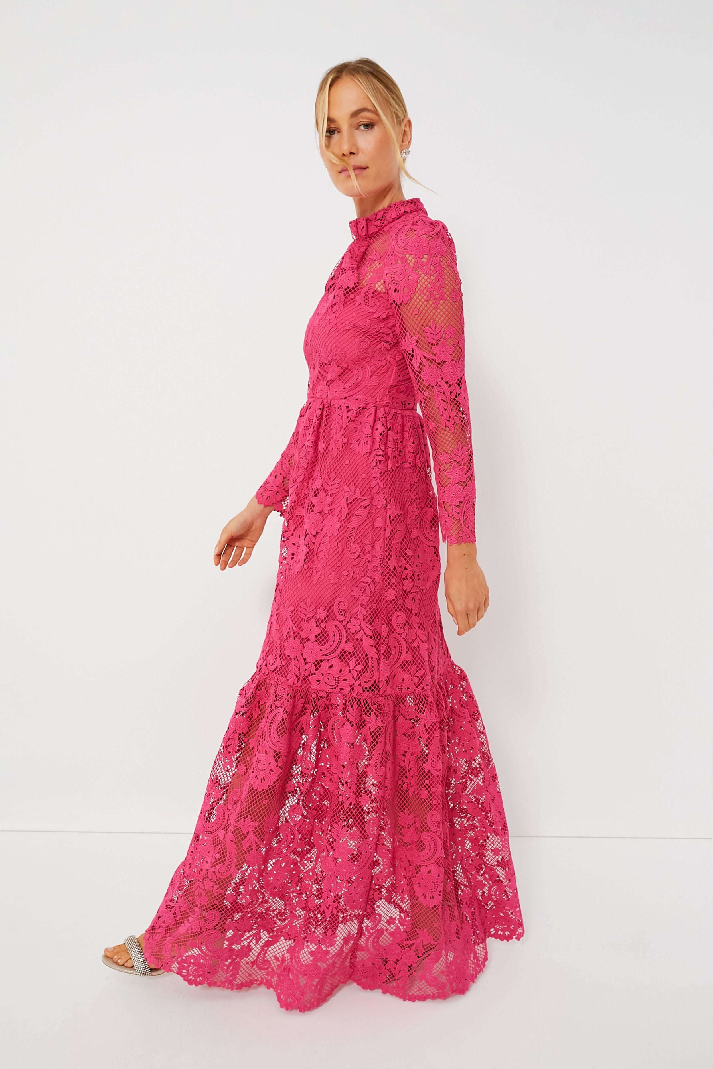 The Pink Maxi Dress is stunning from miles away with its striking hue and gorgeous all-over lace detailing. Featuring a twisted mock neckline. a keyhole cutout at the back. and slim long sleeves. we are giving this silhouette a standing ovation. Style with statement earrings and pumps for star-studded parties and outdoor weddings — just expect to be crowded with compliments!