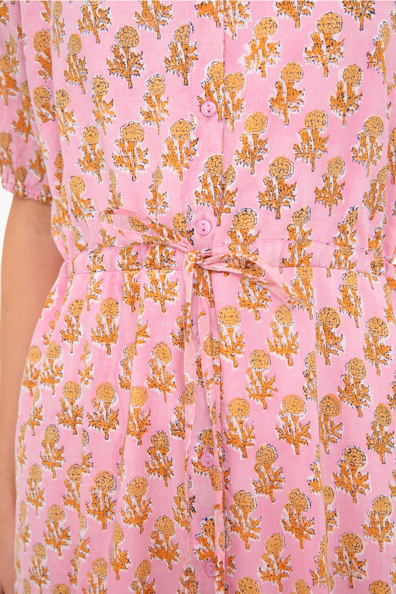 Light. breezy. and full of movement. the Pink Little Marigolds Lucy Dress is made from a cheerful block print making it the perfect midi for any occasion. Featuring short blouson sleeves. a drawstring waist. and button front placket. we are wearing this peachy number for everything from work to brunch to picnics by the sea. Pair with wedges and raffia earrings for an elevated bohemian style.