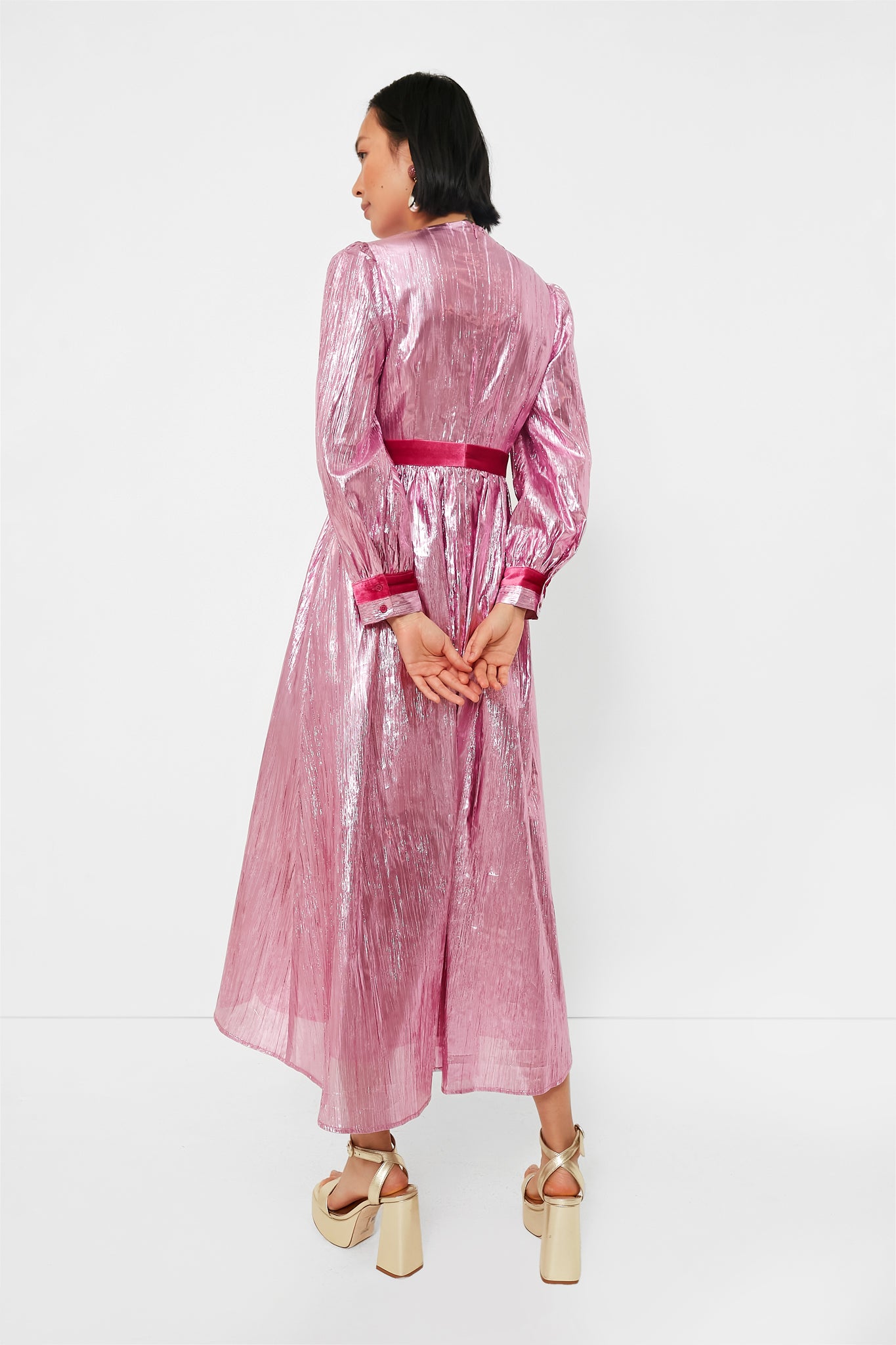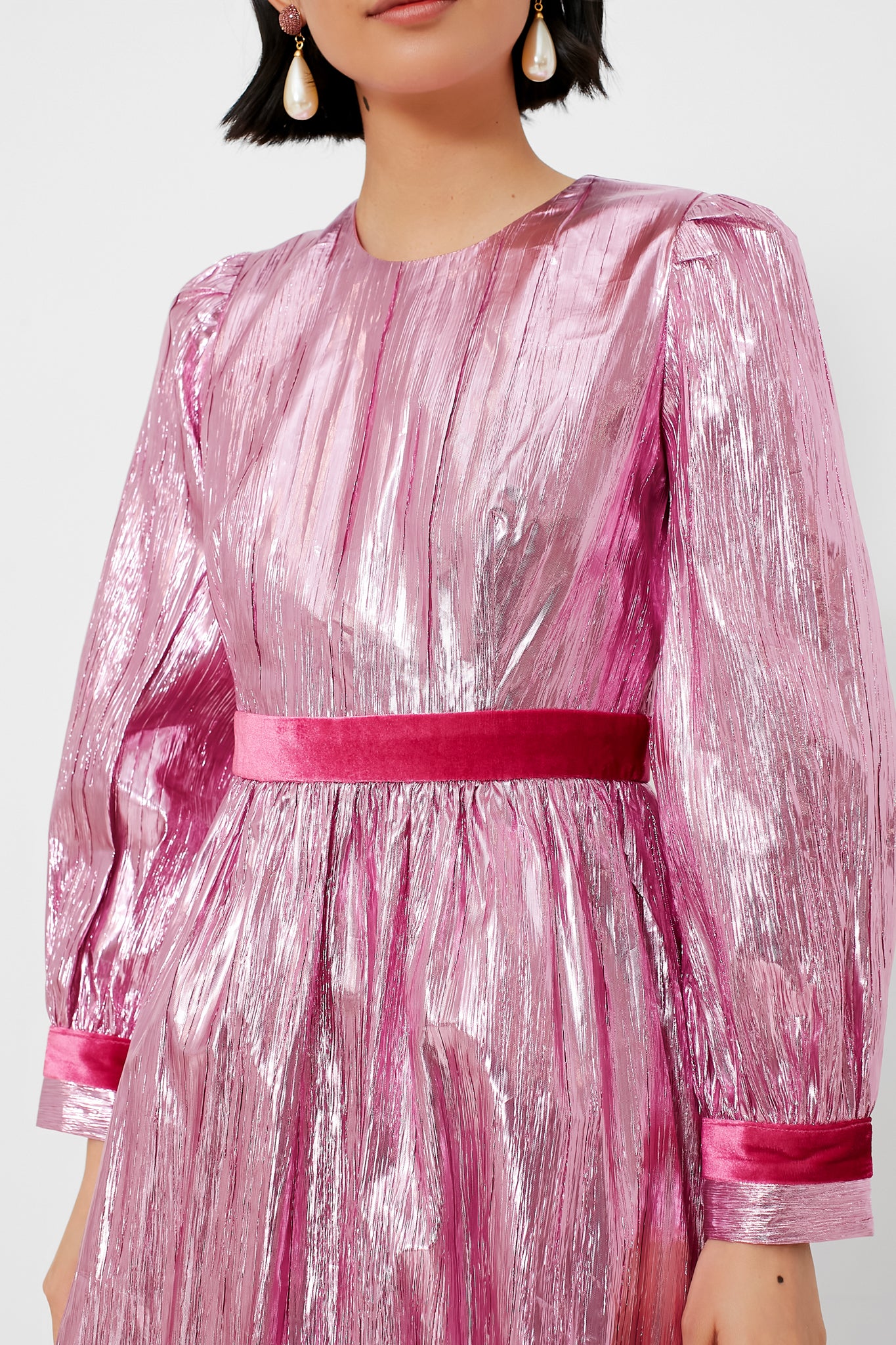 Introducing the Pink Metallic Plisse Eloise Midi Dress- a flirty. fun. and eye-catching look that will be the star of the show. A fit-and-flare silhouette in metallic fabric outlined with a dark pink satin ribbon creates a feminine and striking outfit that makes a polished statement. Style with silver or gold heels and a clutch!
