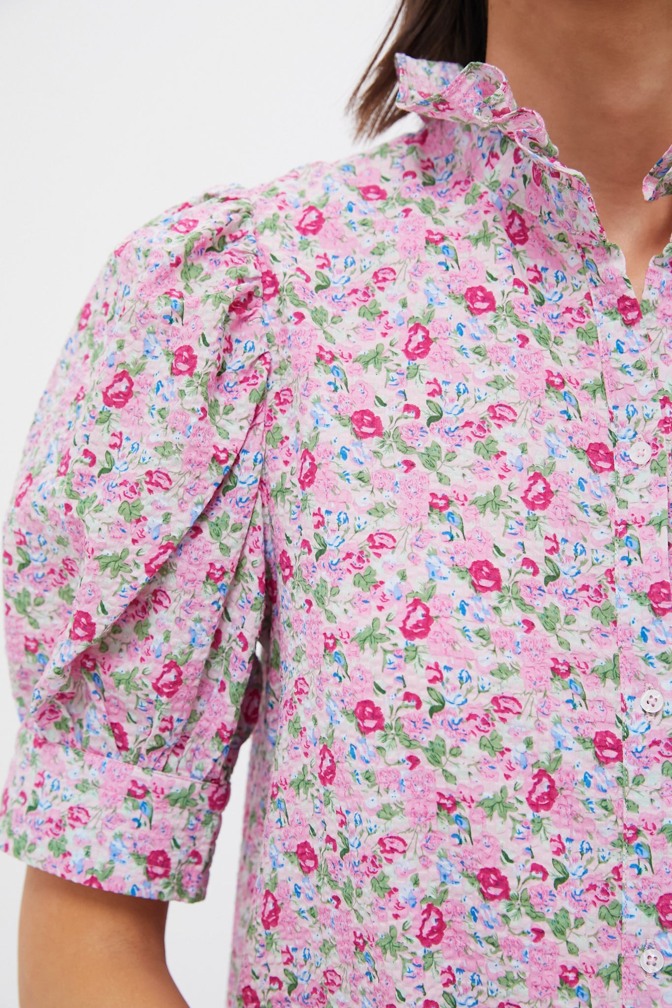 Sweet and chic. the Louisa Dress is a style we know you'll reach for time and time again. Perfect for resort wear. brunches. showers. and anything in between. the ways to style this maxi are endless. Featuring a feminine ruffle stand collar with short puff sleeves in an all-over ditsy pink floral print. this straight silhouette is easy to wear all day long. Pair with chunky heels and a sweater for a casual cool daytime look. or create a little contrast and pair with boots and a leather jacket for added edge.