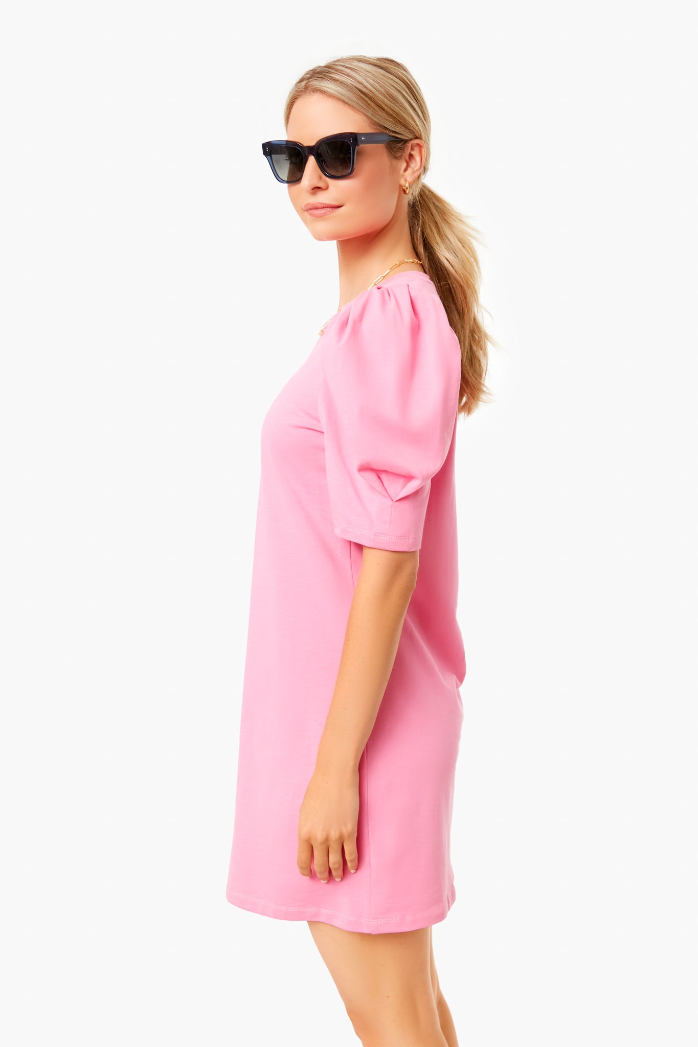 A Go Chicly exclusive. the Pink Stella Dress is effortlessly chic in a fresh color. Featuring a chic puff shoulder and mini length. this style is comfortable and easy to wear. Pair with a tote and sandals for a trip to the market.