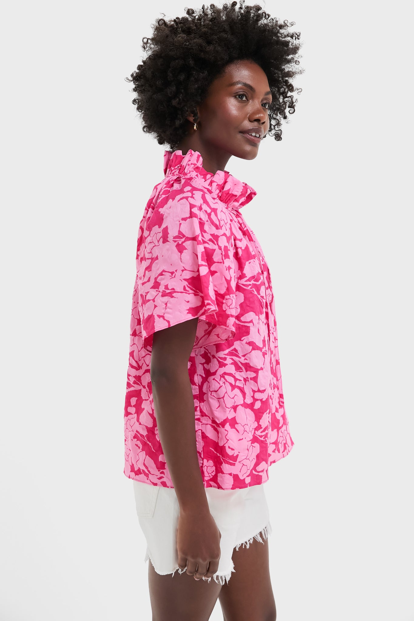 The Pink Textured Floral Thea Blouse is a springtime staple. With a relaxed fit. ruffle stand collar. neck-ties. and flare sleeve. this top has it all. Pair with white denim. sandals. and a raffia clutch for a polished. warm weather look!