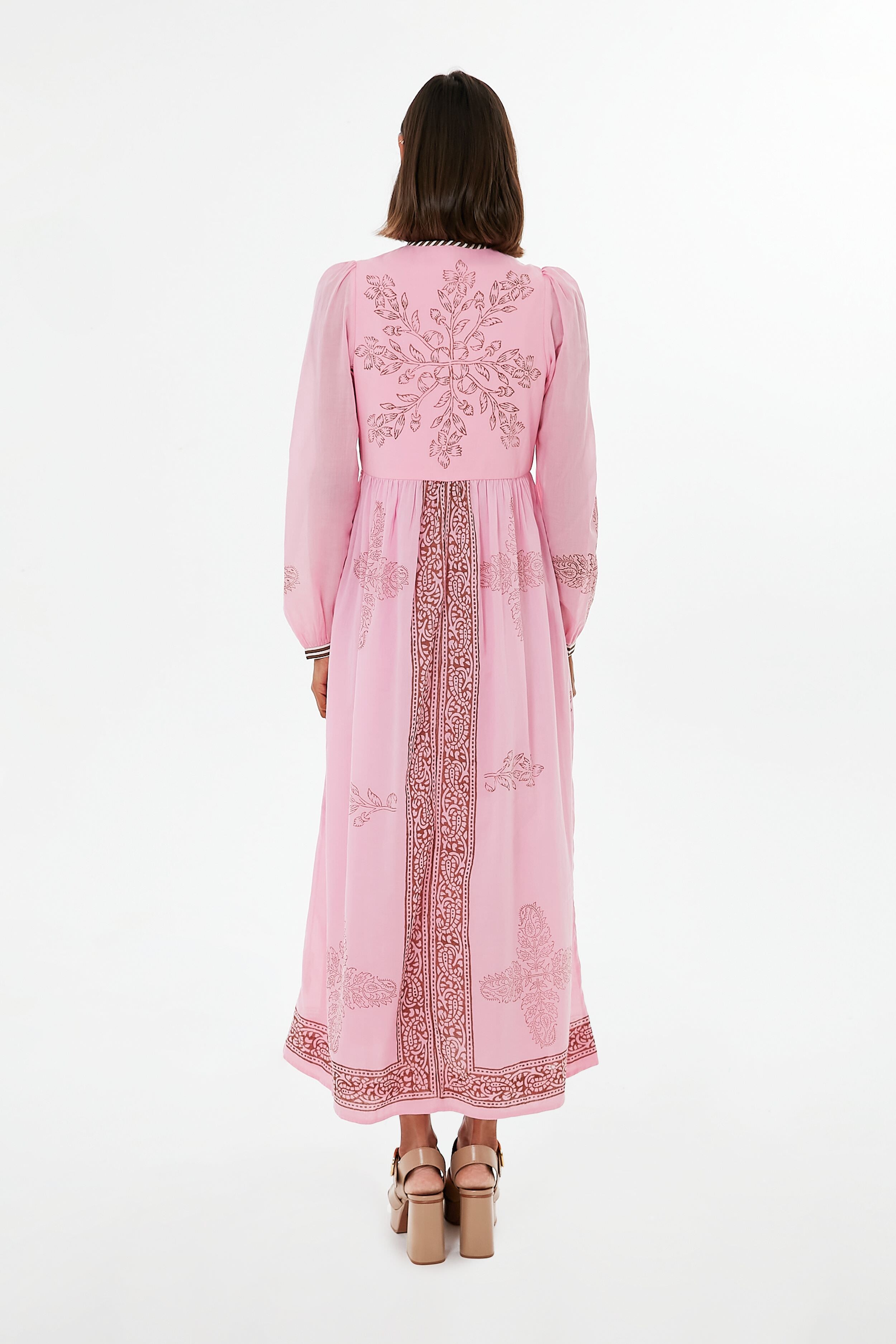 A romantic maxi rendered in hand block printed cotton. the Pink Winifred Guava Dress is a boho-chic dream. Contrasting embroidery details at the notched neckline. button-cuffed blouson sleeves. and a relaxed fit with a breezy gathered skirt make this light silhouette perfect for packing in your vacation bag. Style with a wide brim hat and chunky statement jewelry for a sun-kissed look full of adventure and charm.