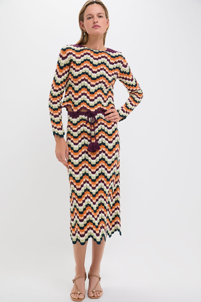 Hand crocheted from cotton to create a contrasting zigzag motif in a mixture of earthy tones with blues and sunset oranges and reds. the Pistaccio and Terracota Pesca Pencil Skirt is a statement piece. With a scalloped edge detailing. and a drawstring tassel waist tie. style it with the matching Pistaccio and Terracota Pesca Top. heels. and a clutch for day or night!