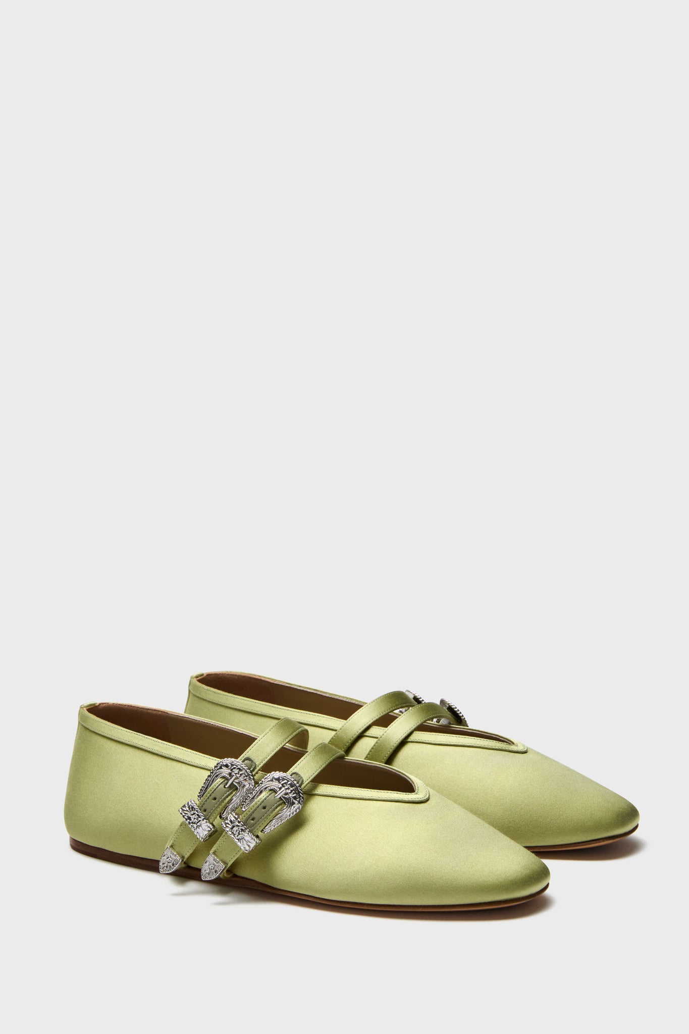 The Pistaccio Claudia Ballet Western Flats blend western-inspired details with a feminine silhouette. This eye-catching style features two adjustable arch straps with buckle closures. a satin body. and a chic pale green colorway. The perfect way to upgrade your staple closet. these can be paired with denim and a simple blouse or a maxi skirt and belt for a more cowgirl-esque ensemble.