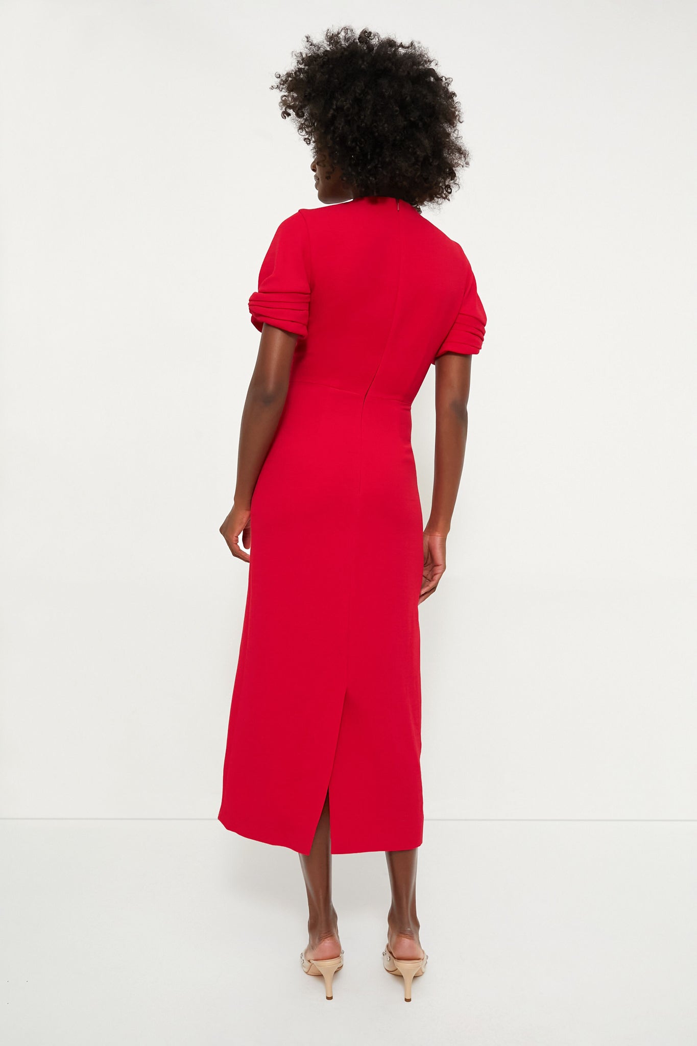 WOW your next gala in the stunning Pomegranate Embellished Short Sleeve Midi Dress. This elegant midi boasts short sleeves with woven pleated cuffs. crystal embellishments along the front shoulders. and a flattering sleek silhouette. Pair with silver jewels and stilettos for a winning evening look.