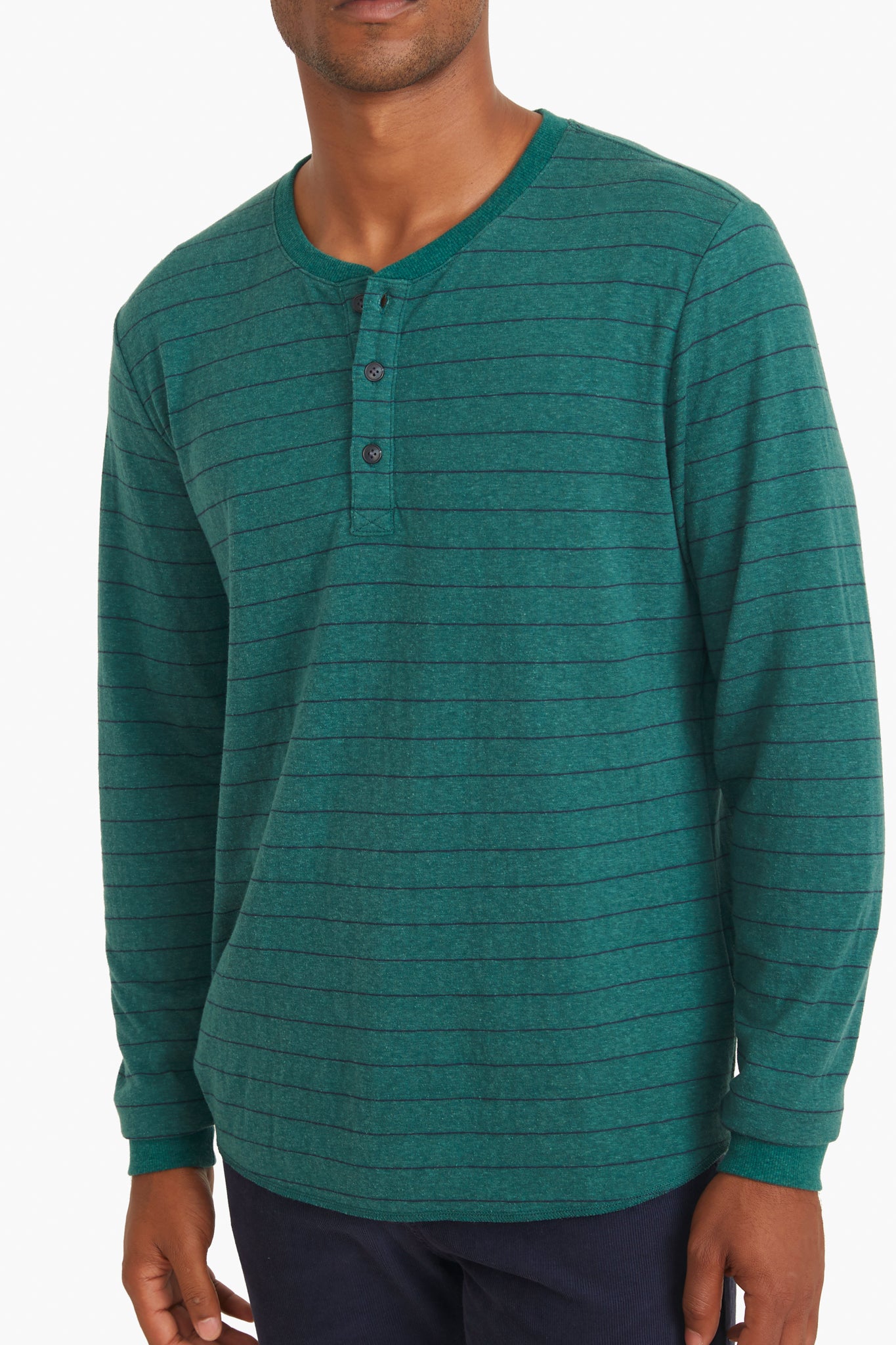 In a super-soft jersey blend fabric that youâll never want to take off. the Ponderosa Pine Navy Stripe Henley is a best-seller for a reason. Washed and faded to old-favorite perfection. this striped shirt features a quarter length placket to elevate it and a classic fit for easy layering. Throw this on with joggers to pick up your order at a local coffee shop. or style with a cool jacket on top to watch a fall football game.