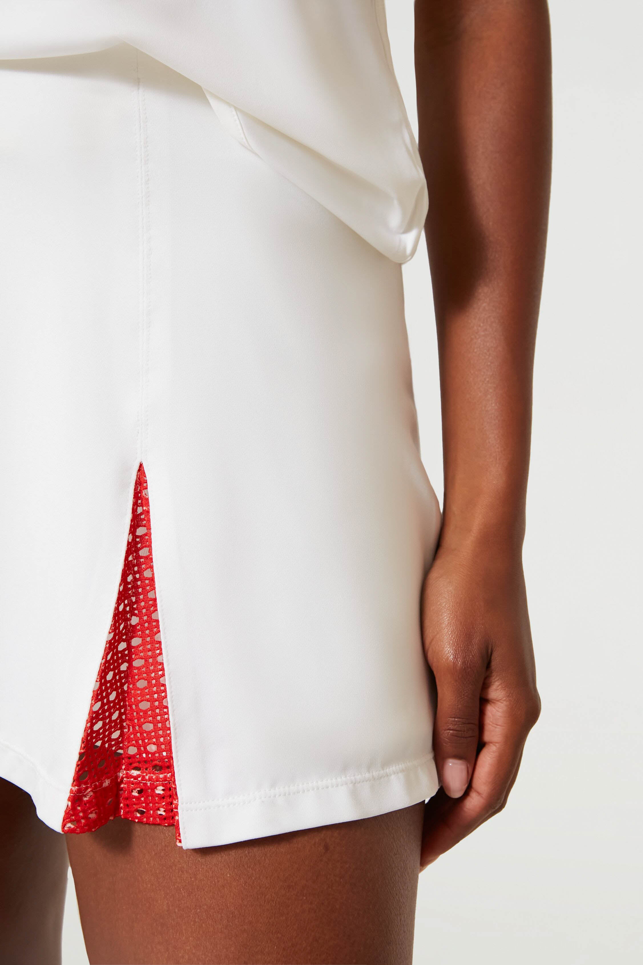 The 14 Inch Carly Tennis Skirt is retro-chic with performance enhancing features such as the compression undershorts. quick dry and wicking properties. and duel pockets for your phone or tennis ball. With feminine details like the contrast gussets. you are sure to make a statement however you style this.