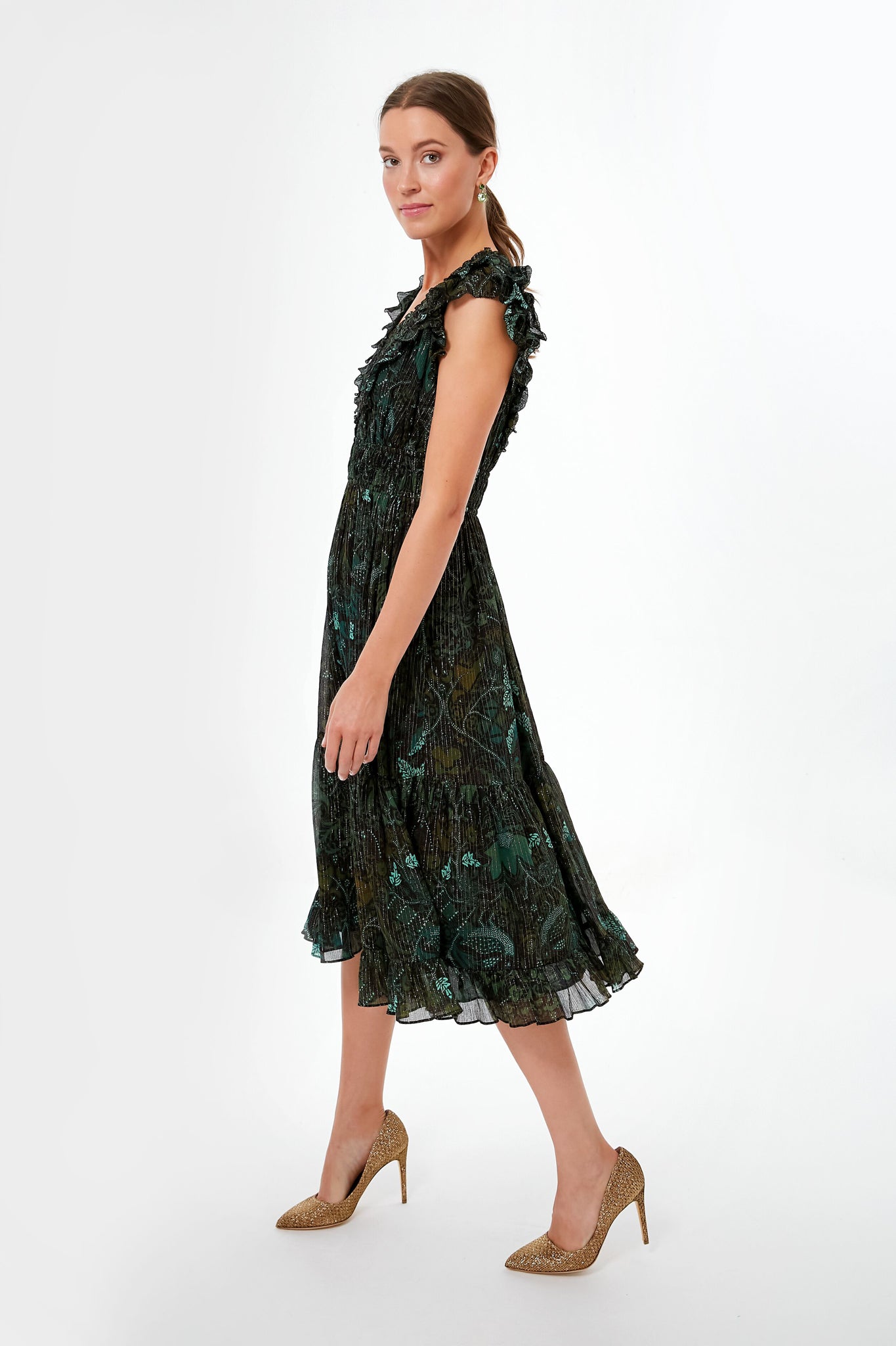 The Rainforest Samara Dress is cut in a lurex-flecked crinkled chiffon that features a mesmerizing botanical motif print. This midi features a tiered skirt. cinched elastic waist. flutter sleeves. and intricate ruching along the neckline. Perfect for party celebrations or dinner dates. just add gold accessories for a twirl-worthy moment.