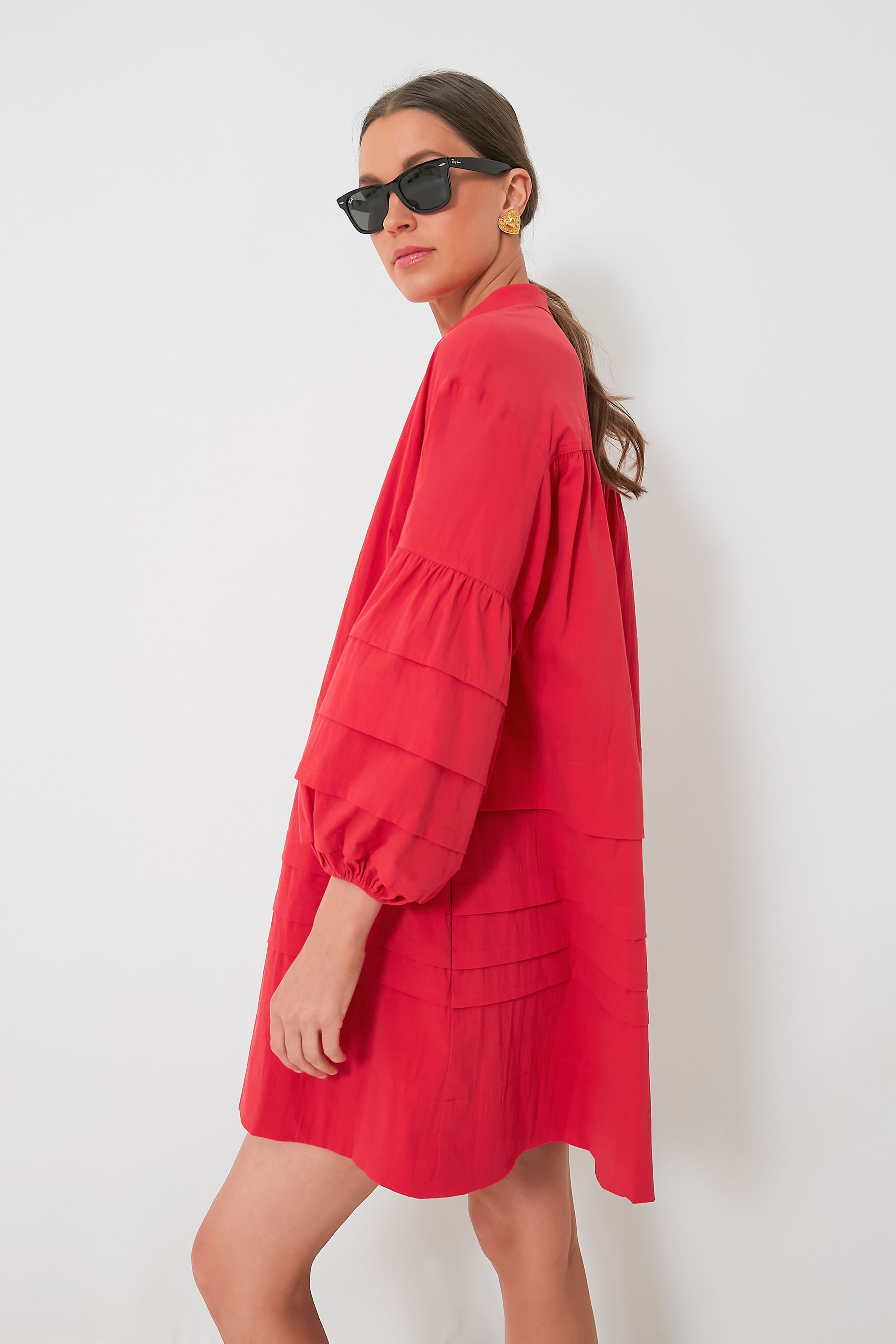 The Chelsea Dress is not to be overlooked. In a fiery red color. this mini combines darling and bold details for a chic. effortless day-to-night piece. A band collar and tiered panel details throughout create an elevated. tailored feel that will take you from desk to drinks with ease. Dress it up with heels and gold accessories or keep is casual with boots and a jacket for running around town.