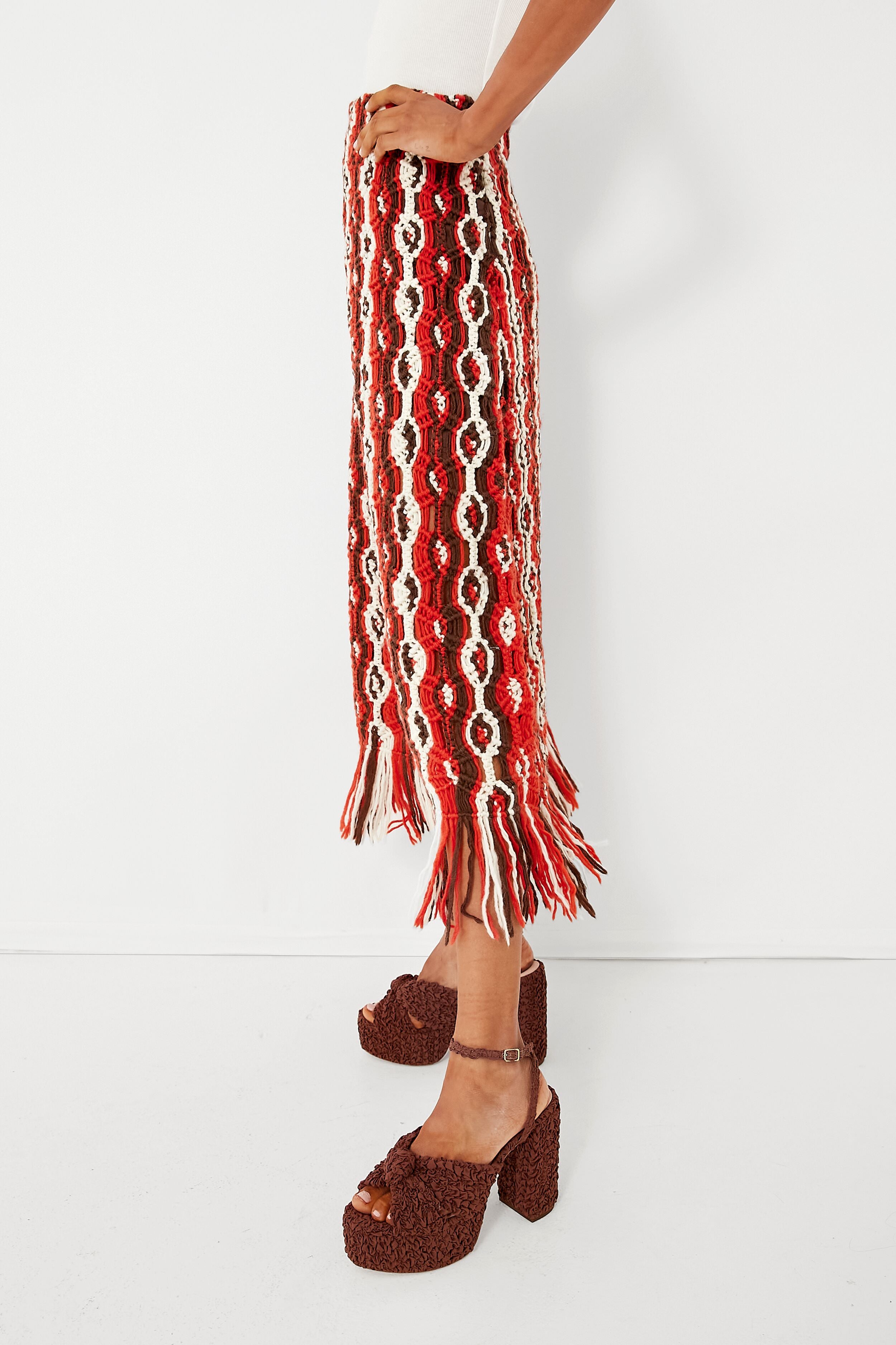 The spirited Drew Skirt is a crowd pleaser and it's all in the details! Made with hand crochet macrame and a fiery red hue. this multi colored knit skirt is the ultimate addition to your wardrobe. Spice up any outfit with this midi by styling with a cropped white tee and strappy sandals for on-the-go or pair with the matching top for an iconic set moment.