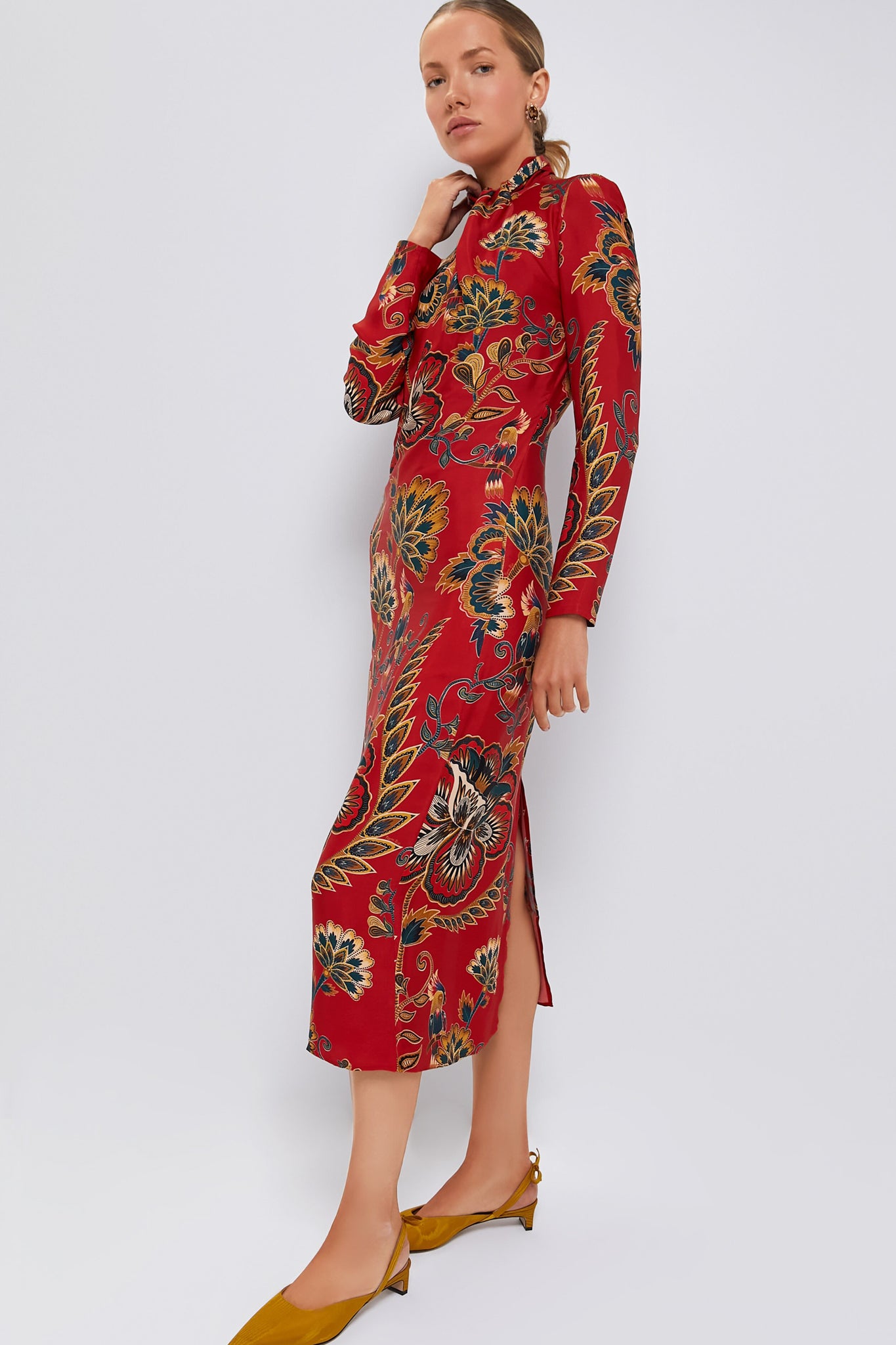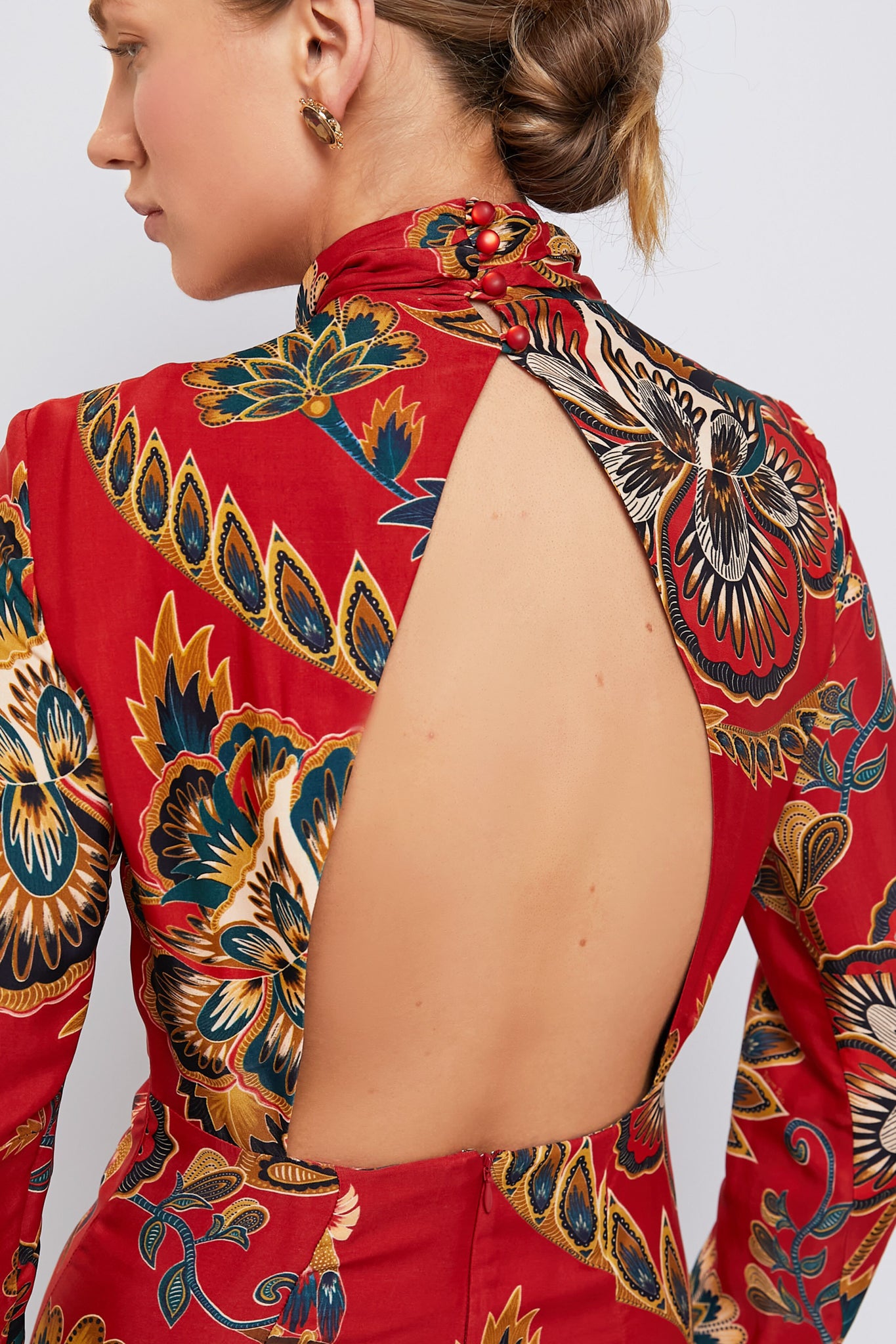 Discover the enchanting allure of the Red Floral Cutout Long Sleeve Midi Dress. The high neckline gracefully flatters. while an unexpected back cutout infuses a graceful touch. The lush. botanical print is seasonless is design. making it a perfect year-round event dress with heels and a gold clutch!