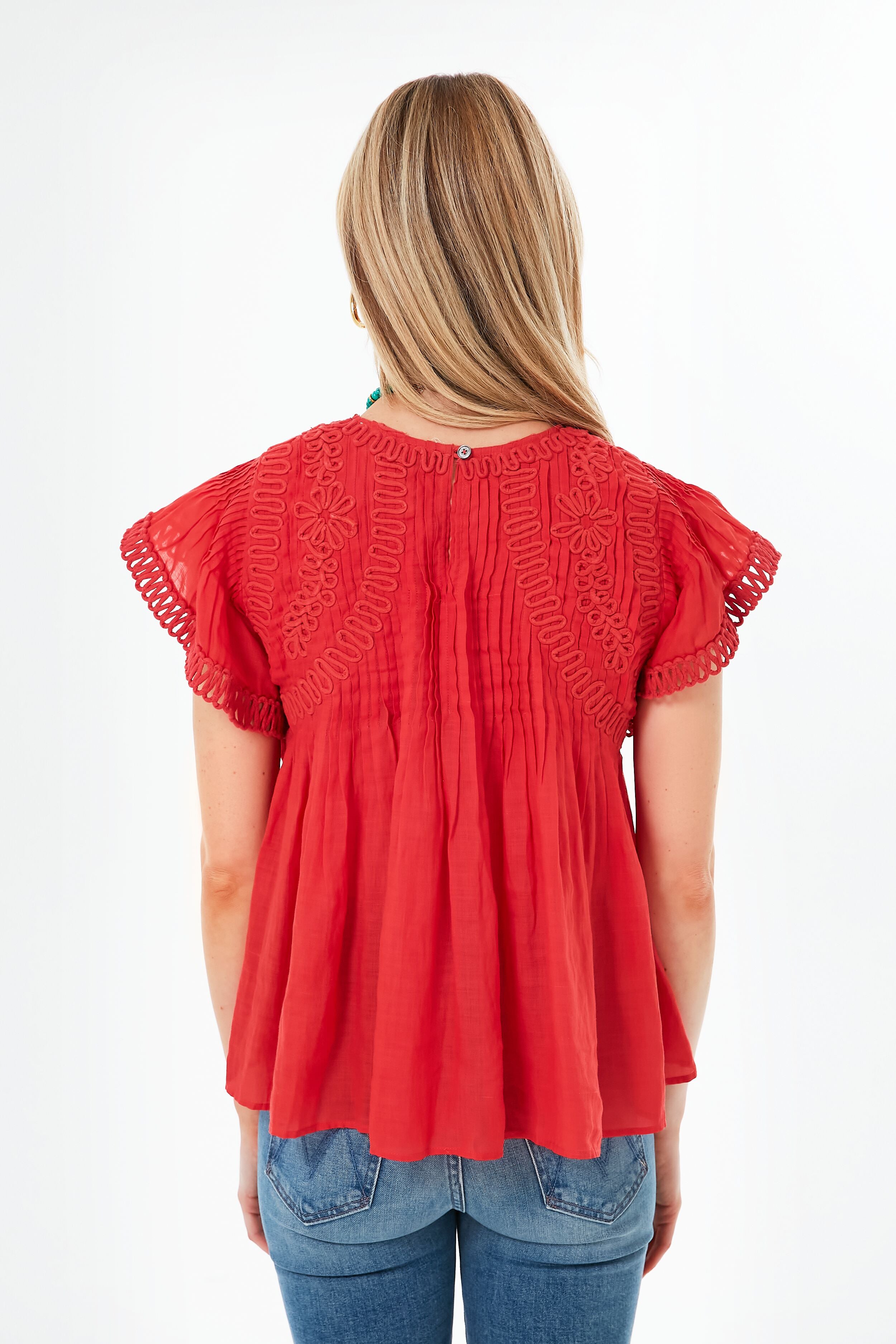 The Red Frida Top is intricately gathered with stunning textural elements that show its attention to detail. Embellished trim at the flutter sleeves. piped embroidery detailing. and pintucking throughout this silhouette add some polish to its relaxed. breezy shape cut from lightweight ramie. As comfortable as it is chic. this blouse looks fabulous when paired with denim for park picnics. or with shorts and sandals to explore sunny vacation towns.