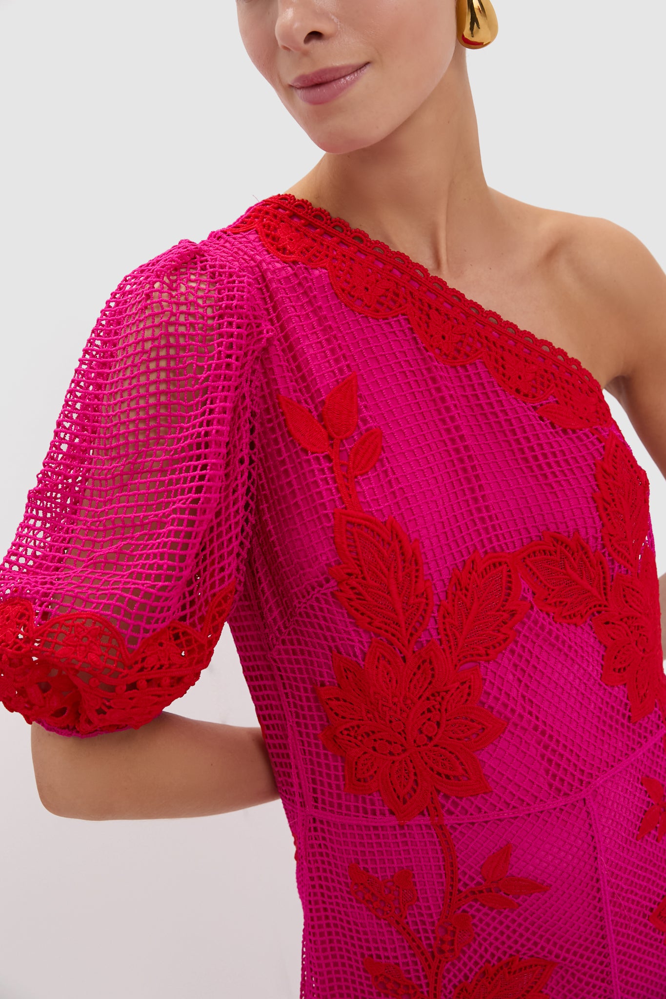 A statement piece that commands attention. this one-shoulder maxi dress stuns with intricate red guipure lace over a striking fuchsia base. The asymmetrical sleeve and scalloped hem add drama. while the self-tie belt cinches the waist for a flattering fit. Perfect for gala nights. destination weddings. or any event where you want to turn heads—just add gold accessories and sleek heels for a show-stopping look.