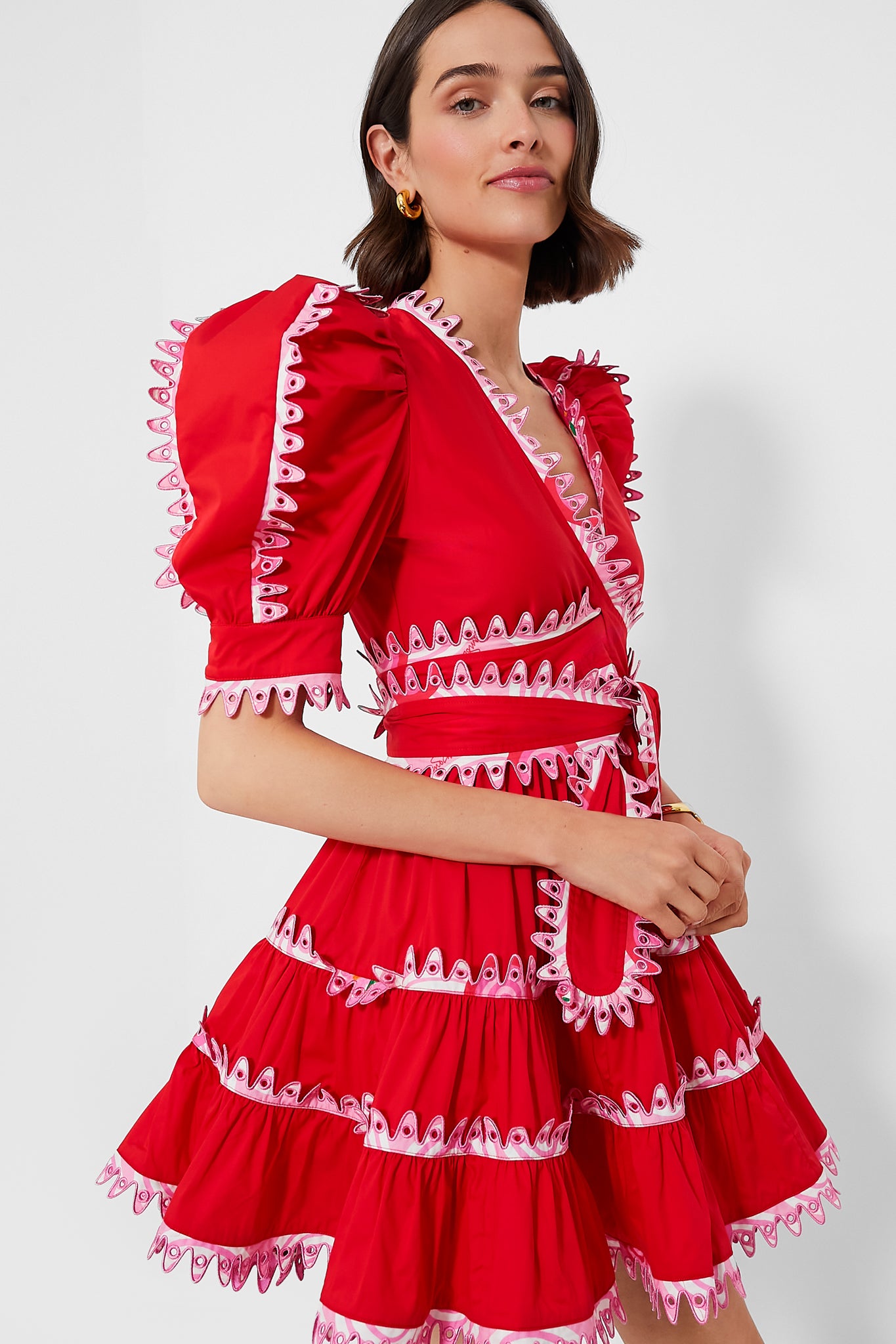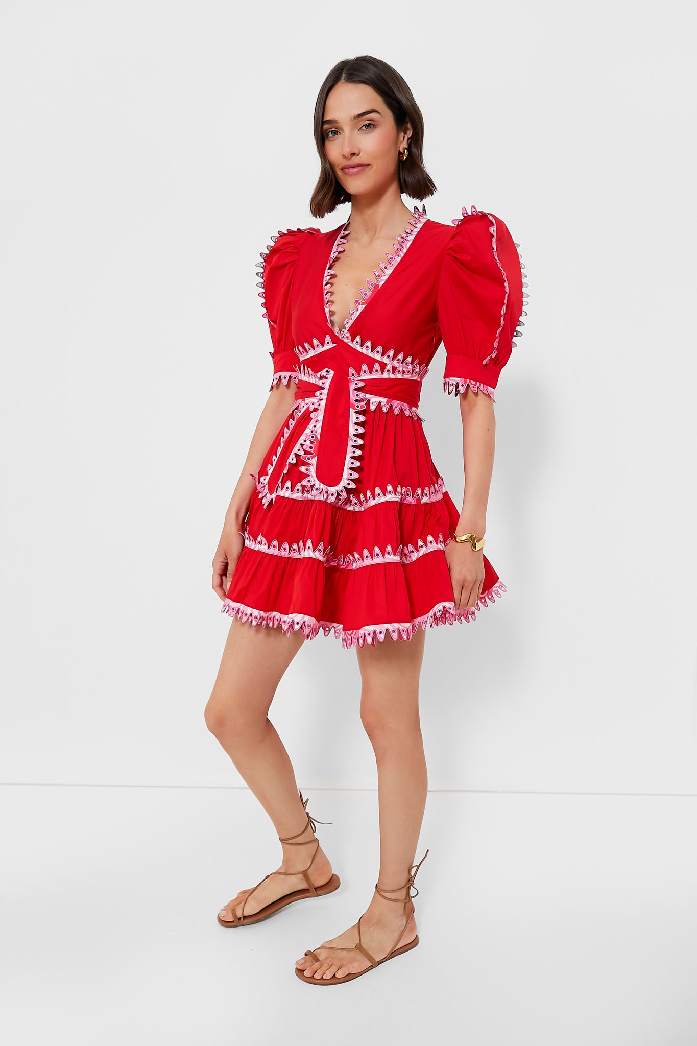 Short. Glamorous and feminine. the Red Hayley Dress is a vibrant statement piece unlike any other. With deep v-neck. puff sleeves. cinched waist. and playful pink triangle trim. this elevated midi plays on texture. shape. and color to create a dreamy look. Pair with heels and statement jewelry for a dinner party. or with sandals for a jaw-dropping daytime look.