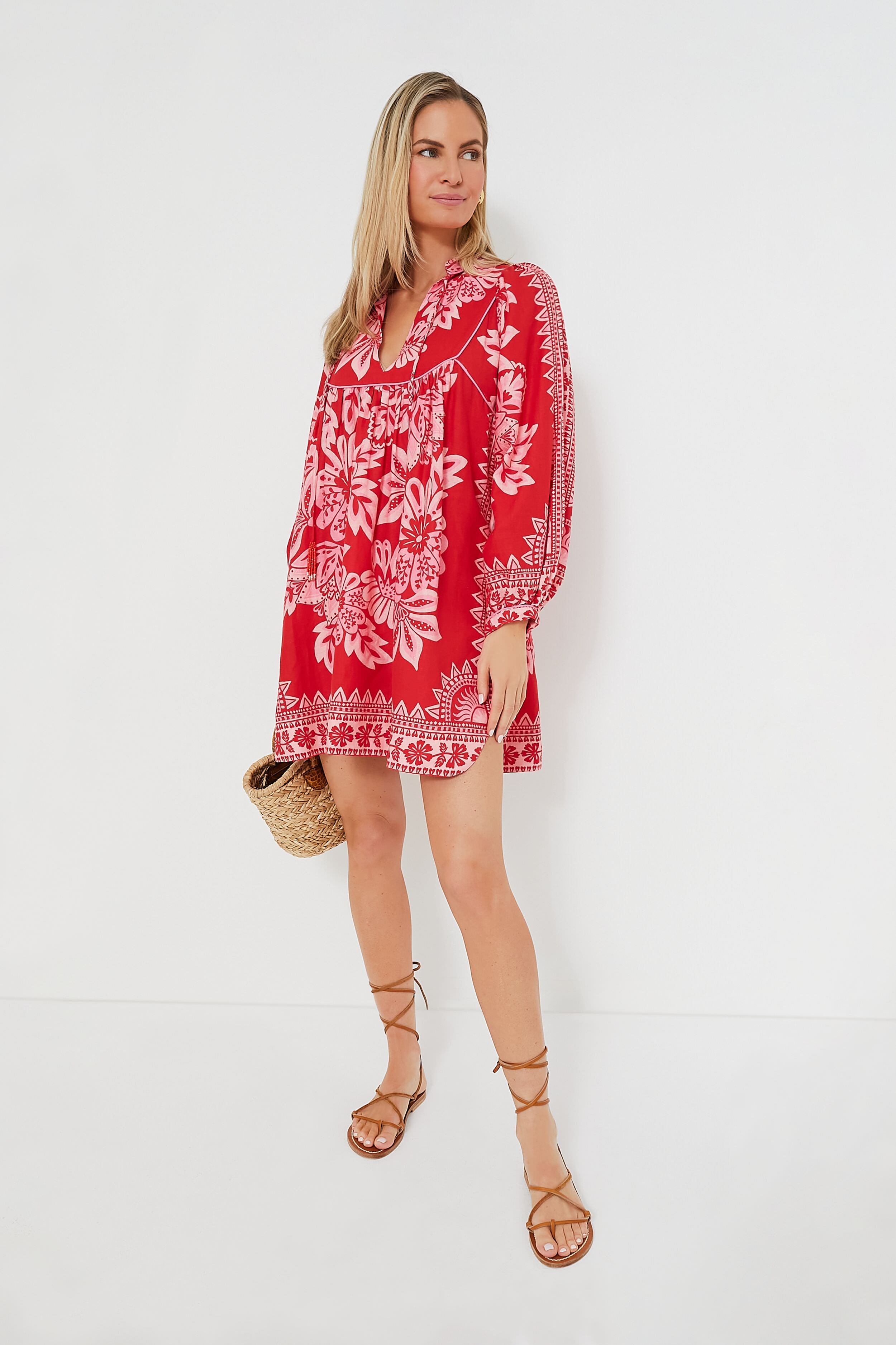 Cut from a linen-blend fabric with a floral print. the Red Flora Tapestry Dress is fiery and feminine. all in one piece. Featuring a deep V-neckline with a self tie and long blouson sleeves this relaxed mini is an elevated outfitting option for any jet setting occasion. Pair it with beachy inspired accessories like pearl earrings and a raffia clutch for a chic resort look that stands out.