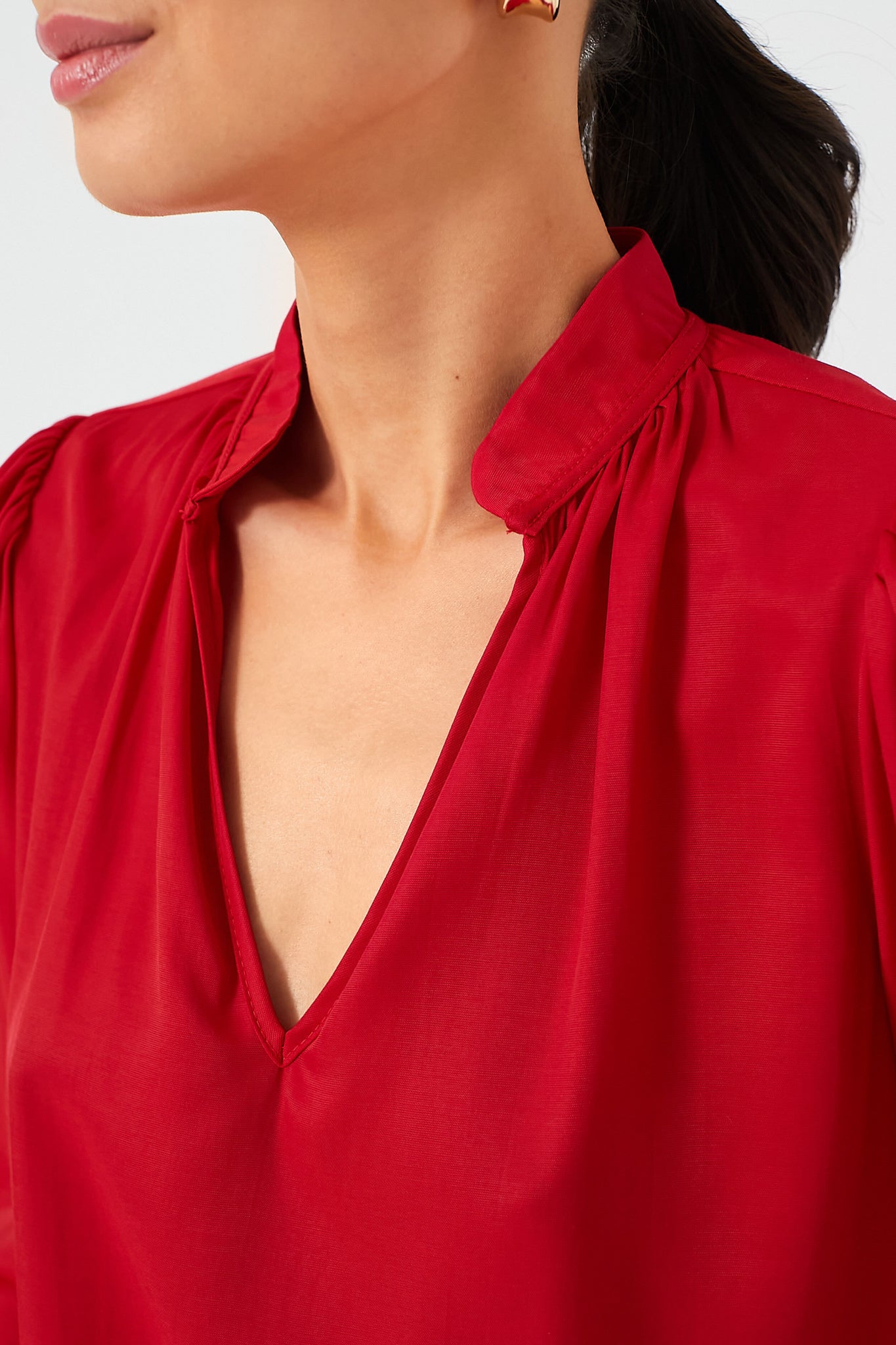 Effortlessly elevated. the Red Phillipa Blouse is a feminine silhouette that can be styled for countless occasions. This top drapes off the body in the most flattering way and features a stand collar with a gathered neckline. bracelet length sleeves. and a lightweight fabric that feels soft to the touch. Opt for dark wash denim and heels for date night and swap for trousers and flats for a day in the office.