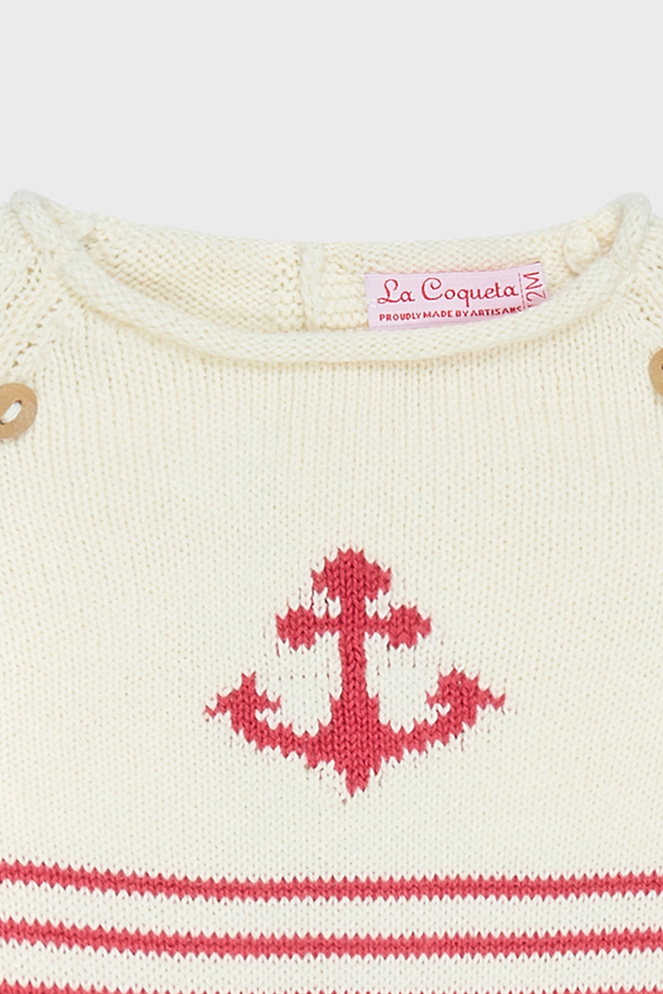 The Red Stripe Ancla Cotton Baby Knitted Set is a timeless two-piece set in a classic shade of ivory. adorned with classic red stripes and a delicate anchor motif. exuding effortless charm and cosy sophistication.The long-sleeve top is thoughtfully detailed with wooden buttons along the dropped shoulders and a mother of pearl button placket at the back for easy dressing. while the matching bottoms are designed with a relaxed fit and stretch cuffs to allow for freedom of movement. Perfect for both playdates and treasured family moments. this nautical set is perfect for your little one.