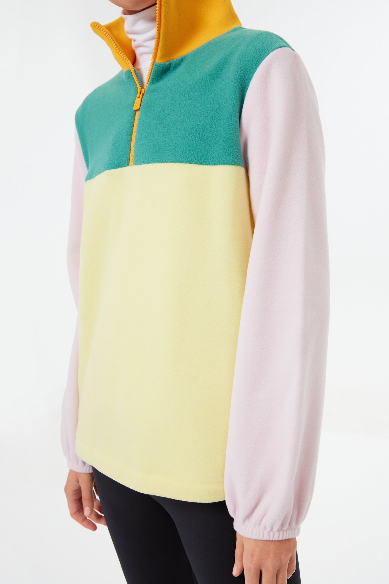 Bring a pop of color to grey days ahead with the Retro Colorblock Potomac Pullover. With a stand collar to keep out the cold. a cozy quarter zip front. and a multicolor patch effect with shades of pink. green. and yellow. this style is a fall and winter must-have. Pair with leggings and a tote bag for a post-yoga class coffee run. or with a beanie and sunglasses to go for a walk in the crisp air.