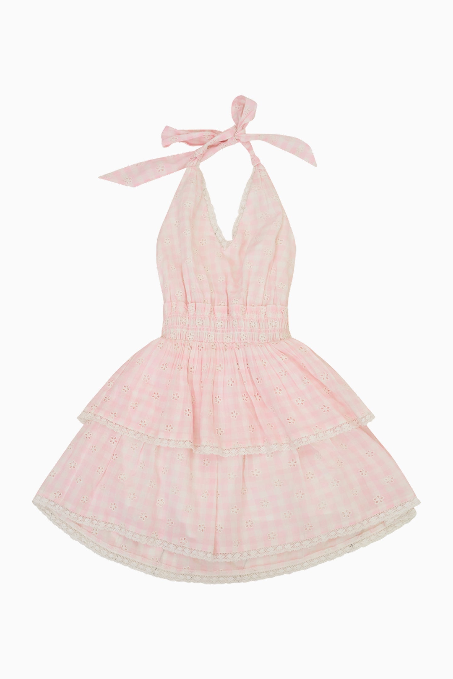 Our best-selling Romille Dress returns with a gingham print on an airy. cotton fabric. This charming dress for our littles stuns with an airy cotton fabric featuring sweet cherry embroidery scallop detailing on the skirt's ruffle tiers. The dress begins with a V-neckline that falls to an elasticated waistband above a two-tiered mini skirt.