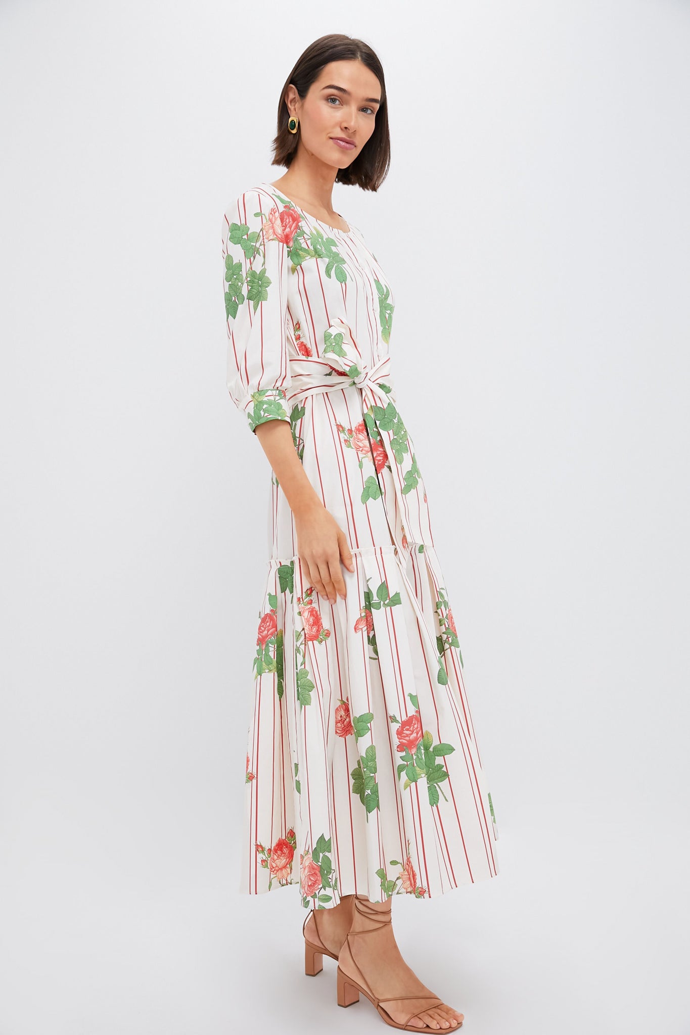 The Rosa Fiora Dress is a beautiful floral maxi for your next springtime occasion. With a round neck. front button placket. self tie belt. and tiered skirt. no detail was left behind on this beauty! Perfect for springtime holidays. shower celebrations. or an elevated vacation dinners Al Fresco. we styled it with nude heeled sandals and a woven tote!