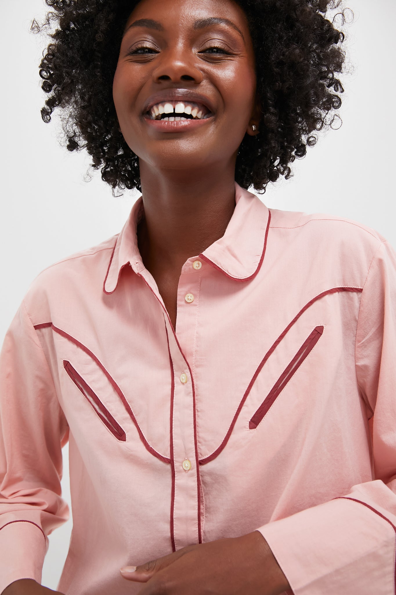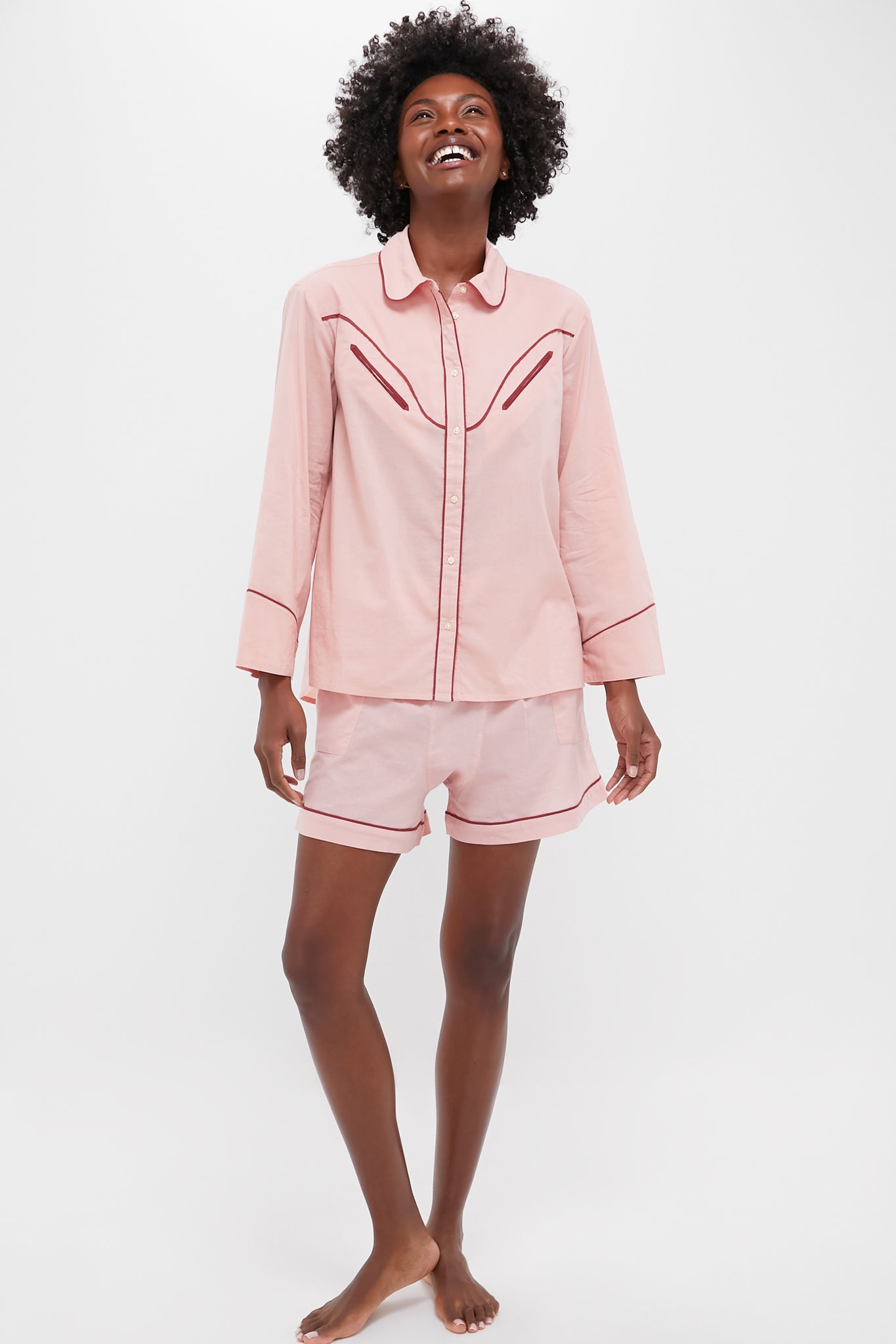 Comfortable and relaxed in shape. this sleepwear style features a collared neckline. button-front closure. and Western-inspired yoke with welt pocket detailing. Made of soft 100% cotton and trimmed with contrast piping. it pairs perfectly back to the Rose Bloom The Square Pajama Short for a coordinated set.