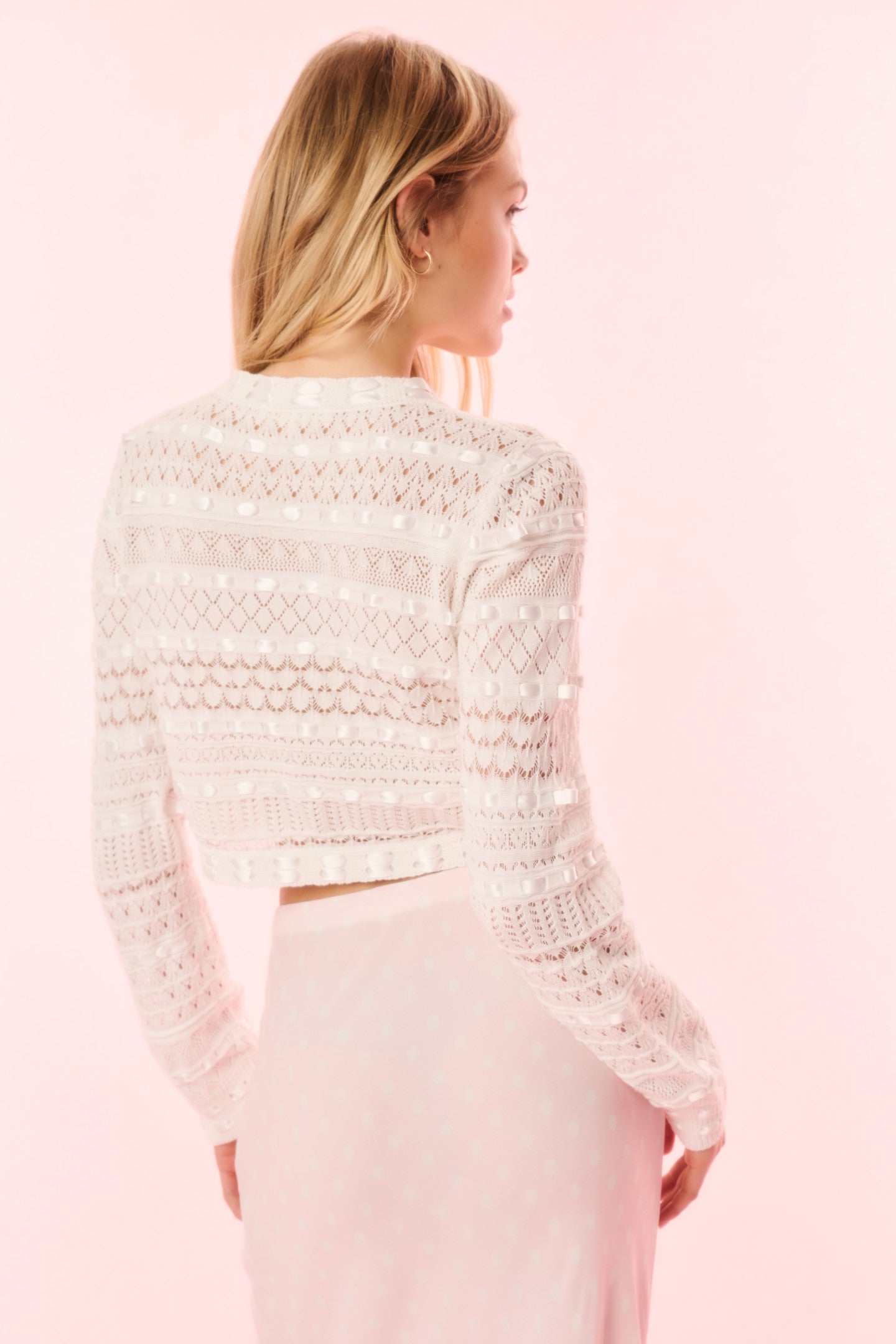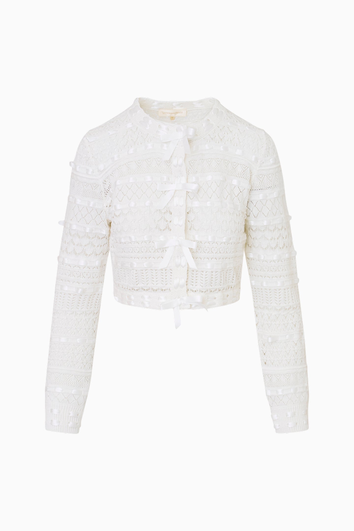 The Roselline Cardigan returns in a lightweight cotton fabric with delicate mixed pointelles all over and a satin ribbon woven throughout. Delicate bows adorn the center front placket lined with grosgrain while hidden snap closures line the inside. Rib trims adorn the neckline and arm cuffs.