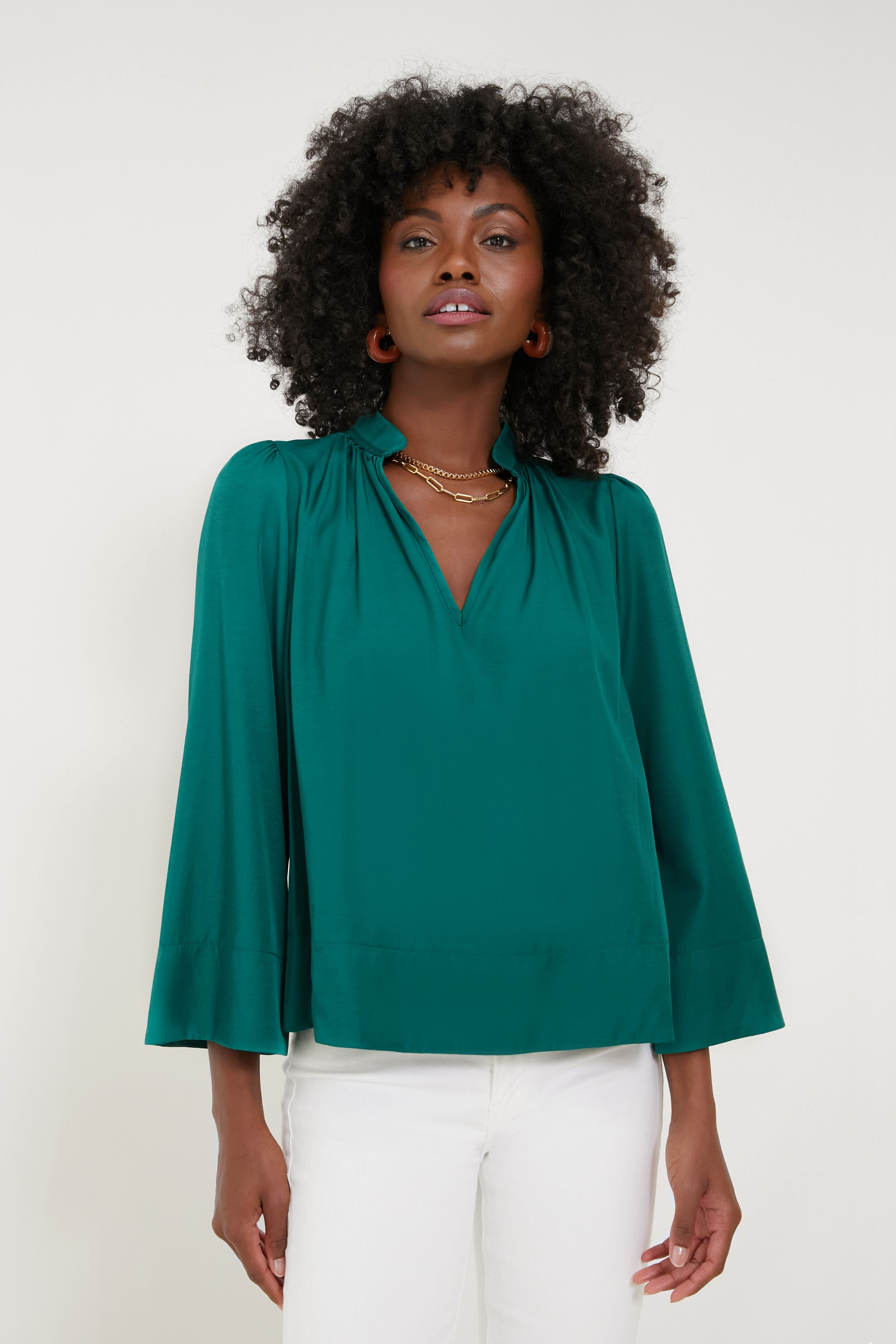 Effortlessly elevated. the Rosemary Phillipa Blouse has a slight sheen to it that accentuates its luxe green hue. This top drapes off the body in the most flattering way and features a stand collar with a gathered neckline. bracelet length sleeves. and a lightweight fabric that feels soft to the touch. Opt for light denim and sandals for a glamorous brunch look and swap for trousers and flats for a day in the office.