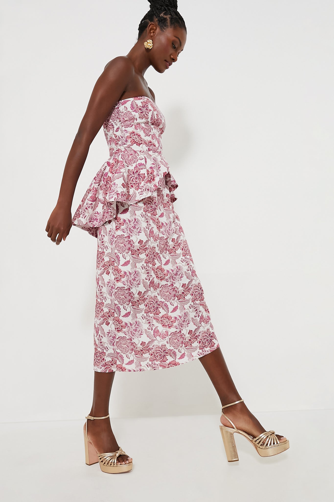 The chic Rosewood Floral Roxanne Midi Dress is the event dress of the year. With a strapless neckline. straight silhouette. and peplum waist. this flattering midi will make you look as if you stepped straight out of a runway. Pair with heels. drop earrings. and a clutch for an event look that will win "best in show".