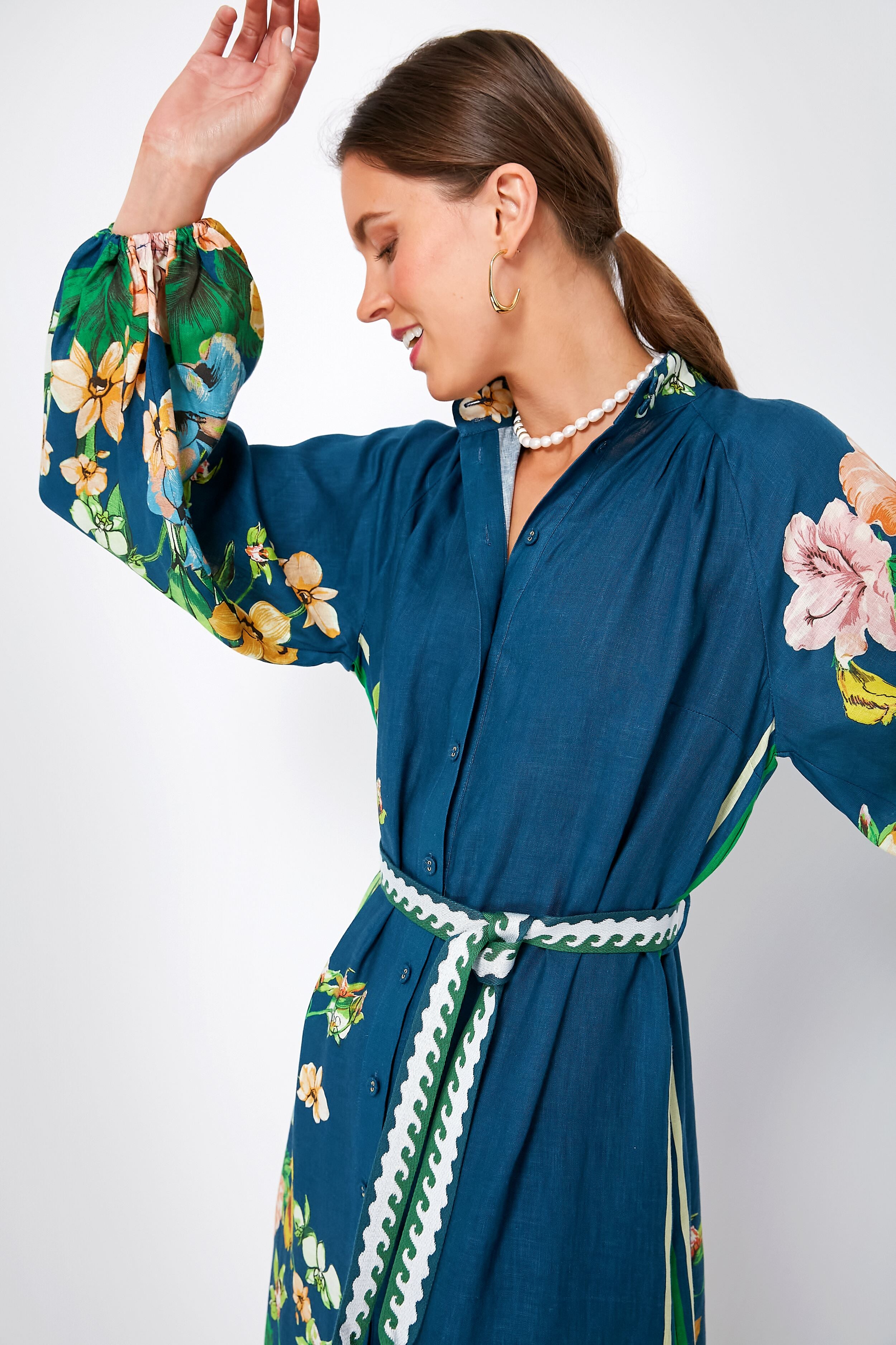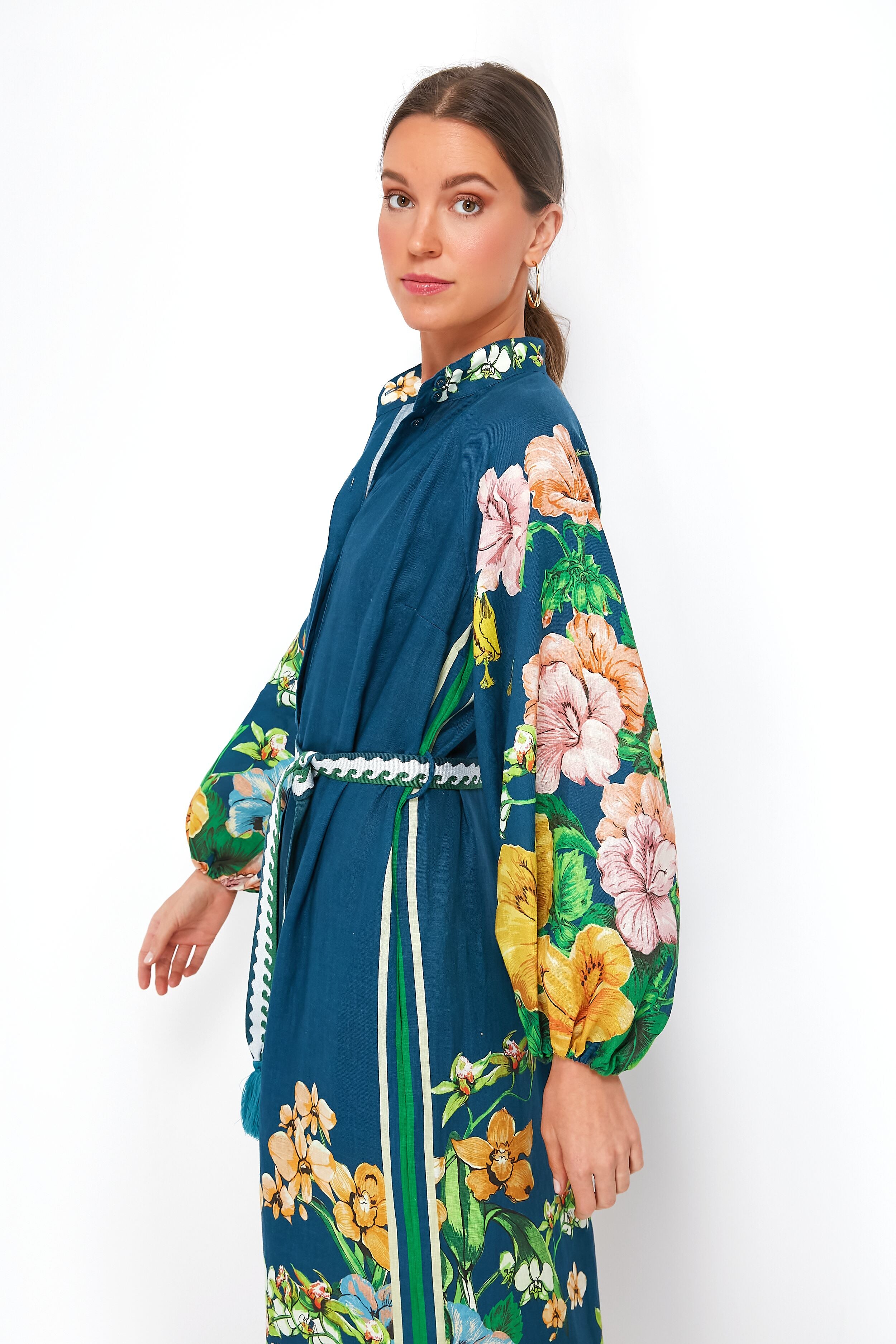 Hello head turner. the Royal Blue Lyla Dress is a relaxed shirt dress with a whole lot of personality. Featuring a beautiful botanical print that climbs the hem. floral motifs that decorate the exterior and interior of the stand collar. and a woven jacquard belt complete with tassels– there is no shortage of details here. Effortlessly look put-together yet laid back with this boho midi. add heels to elevate this number for date night or pair with sandals for a causal park picnic.