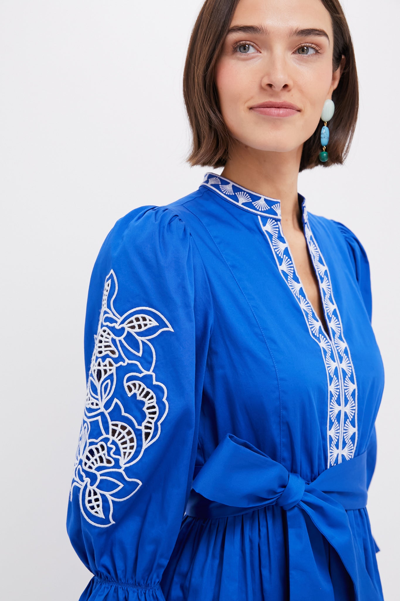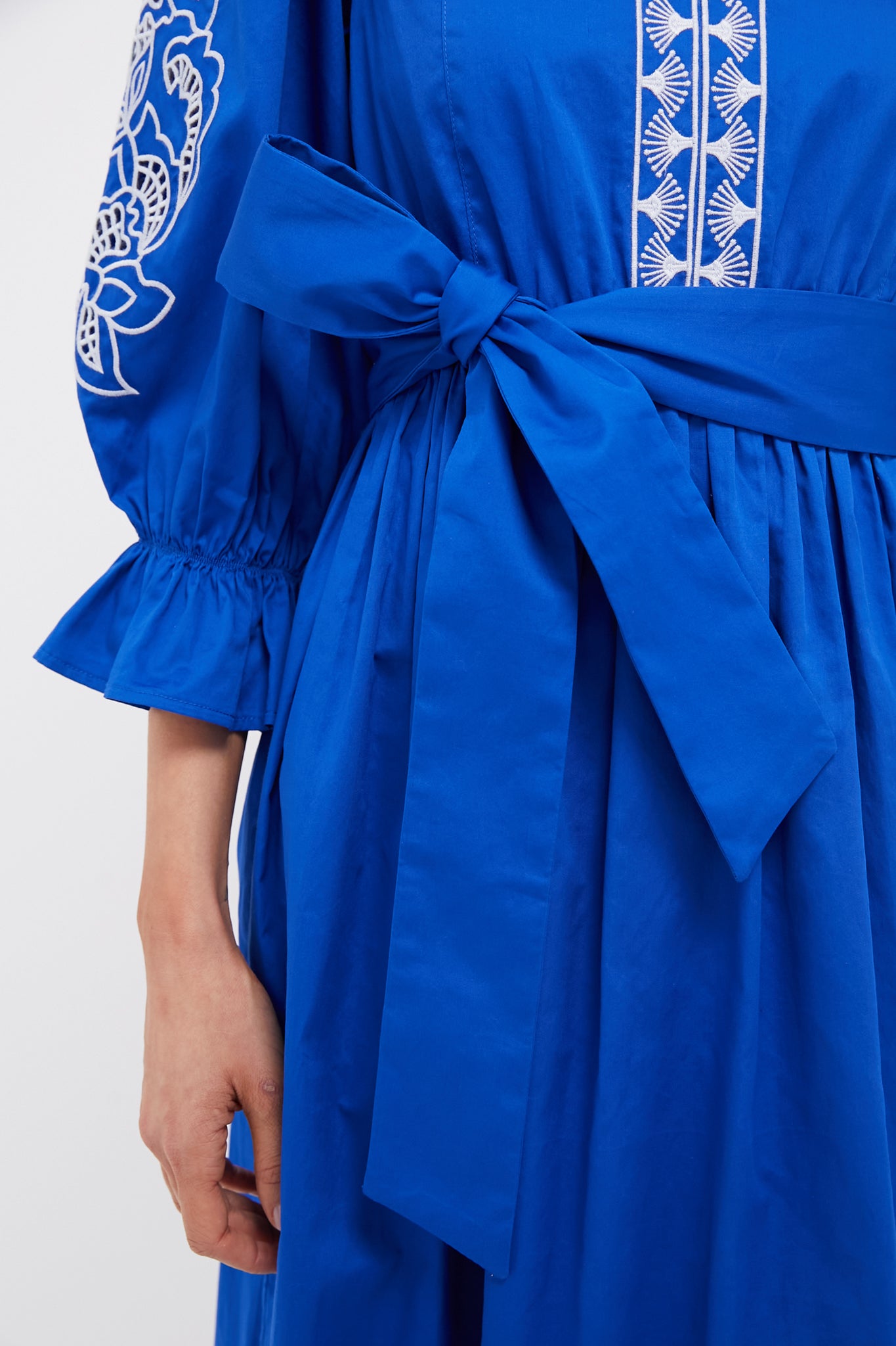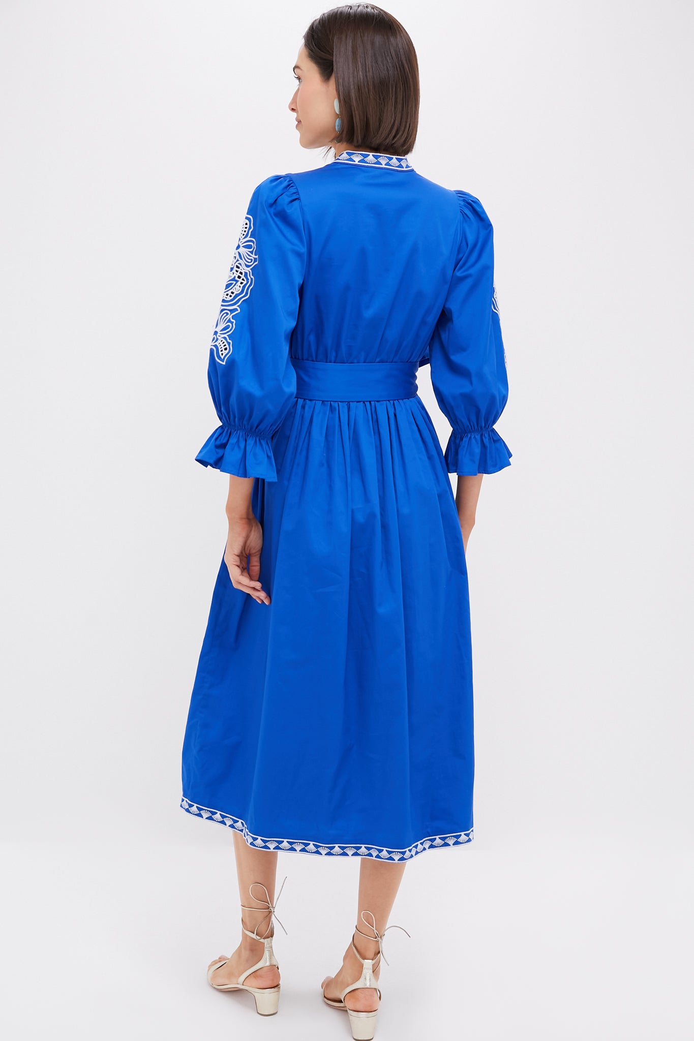 The Royal Blue with Baby Blue Embroidery Dowling Midi Dress is a flattering. feminine silhouette boasting ruffle cuffs. a self-tie waist belt. and embroidery detailing throughout. Pair with heels or sandals for versatile and chic styling!