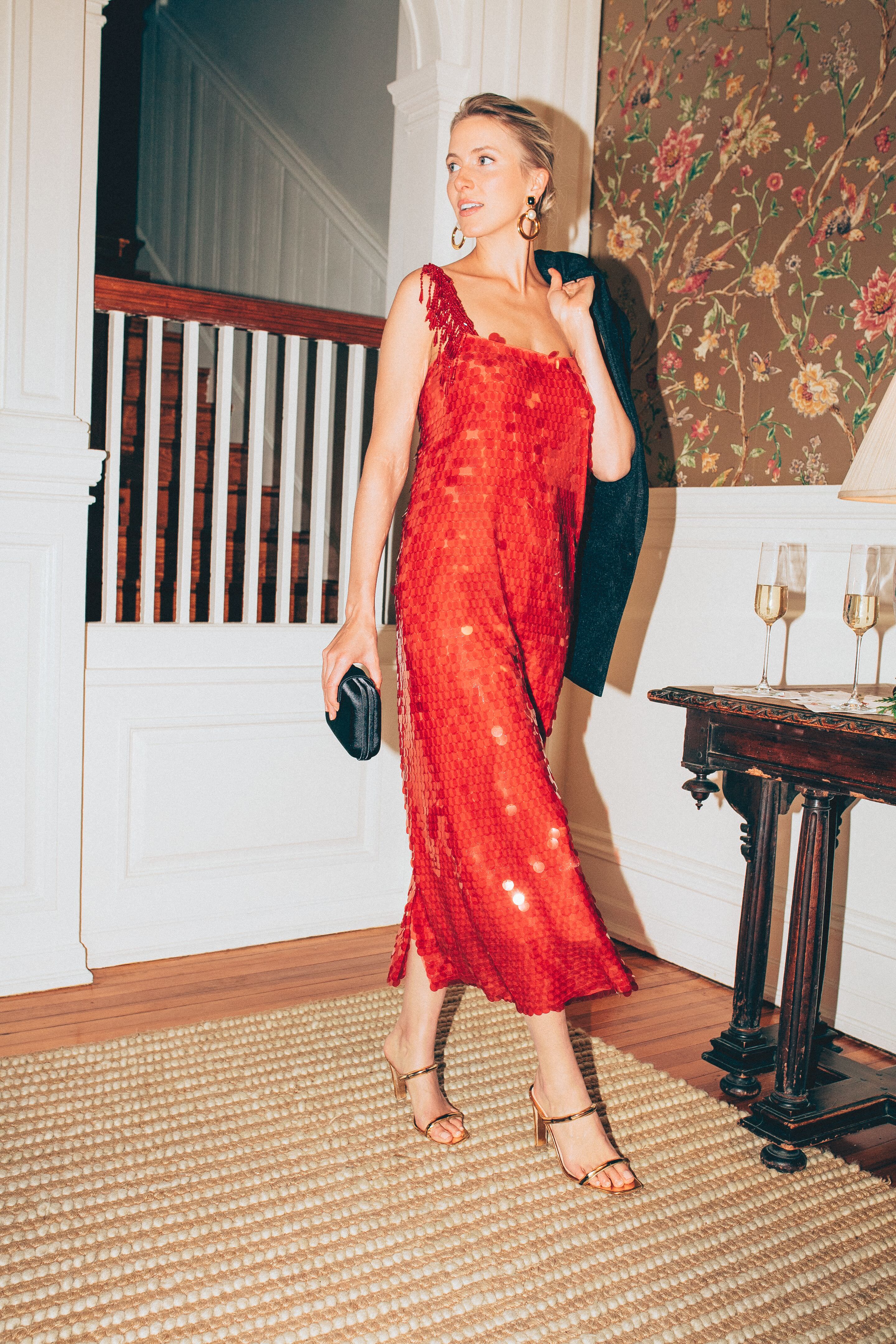 Hello. party girl! Make an entrance in the Ruby Paillette Felici Dress. This stunning midi features all-over sequins and beaded fringe at the straps that jingle beautifully with movement. In a flattering sheath silhouette with an elegant square neckline. this number was made for dancing the night away. Pair it with drop earrings. a glittery clutch. and heels. then you are ready for a truly twirl-worthy evening.