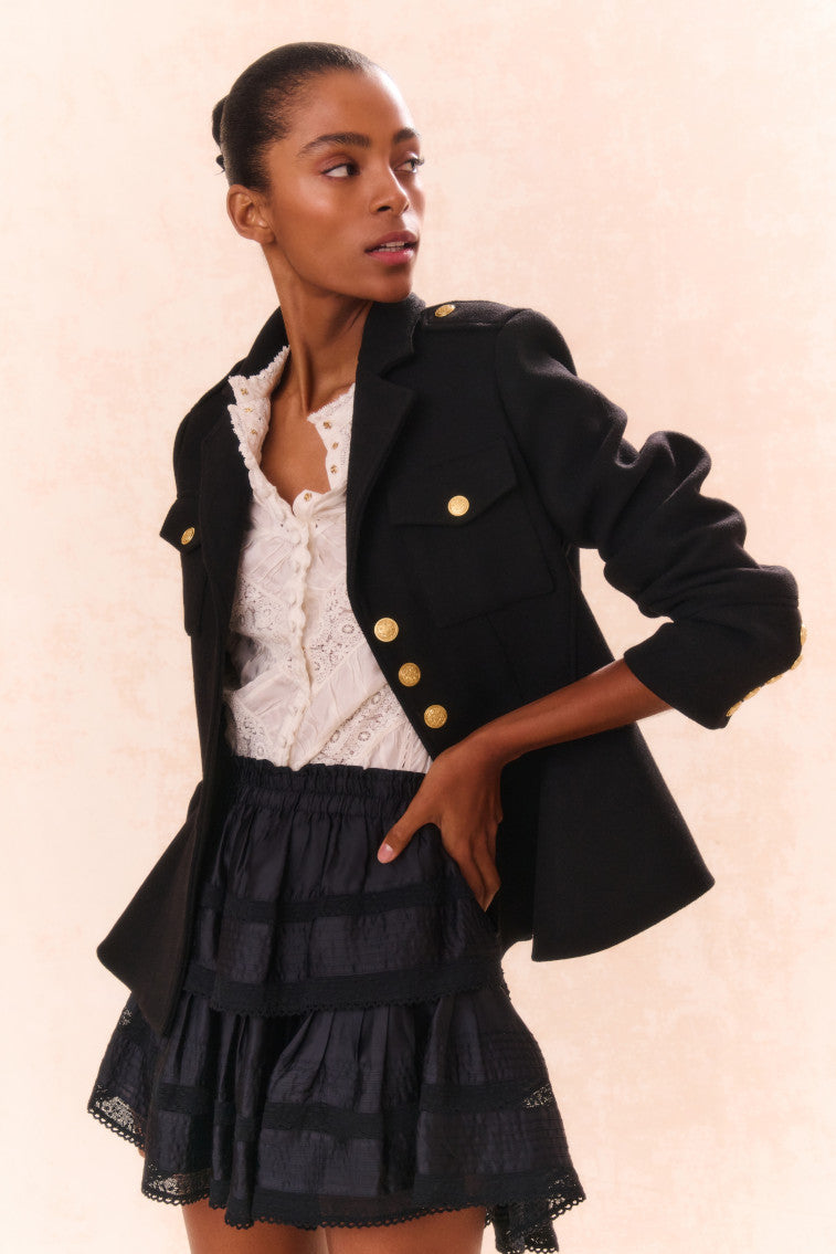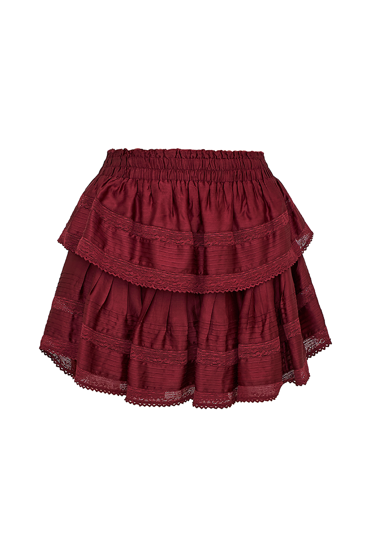 Our best selling Ruffle Mini Skirt returns for the season in a viscose fabric. She features intricate inset lace trims and allover pintuck details. The elasticated waistband and double lining offers flexibility in comfort and styling. Tiered ruffles exude effortless femininity. The mini is finished with a frayed. raw hem for added playfulness.