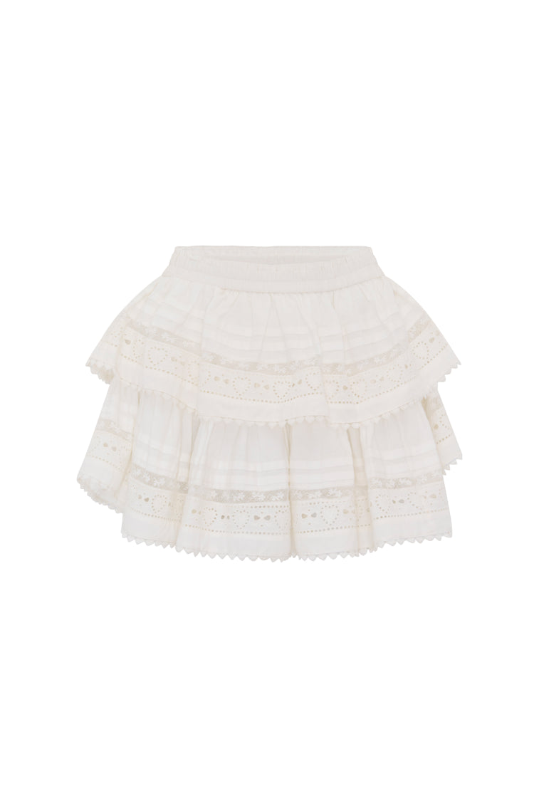 Our best-selling Ruffle Mini Skirt returns for Valentine's Day with a crisp cotton poplin fabric with stunning details like Victorian-inspired laces with heart eyelets all over. She features intricate inset lace trims and allover pintuck details. The elasticated waistband offers flexibility in comfort and styling. Tiered ruffles exude effortless femininity. The mini is finished with a frayed. raw hem for added playfulness.