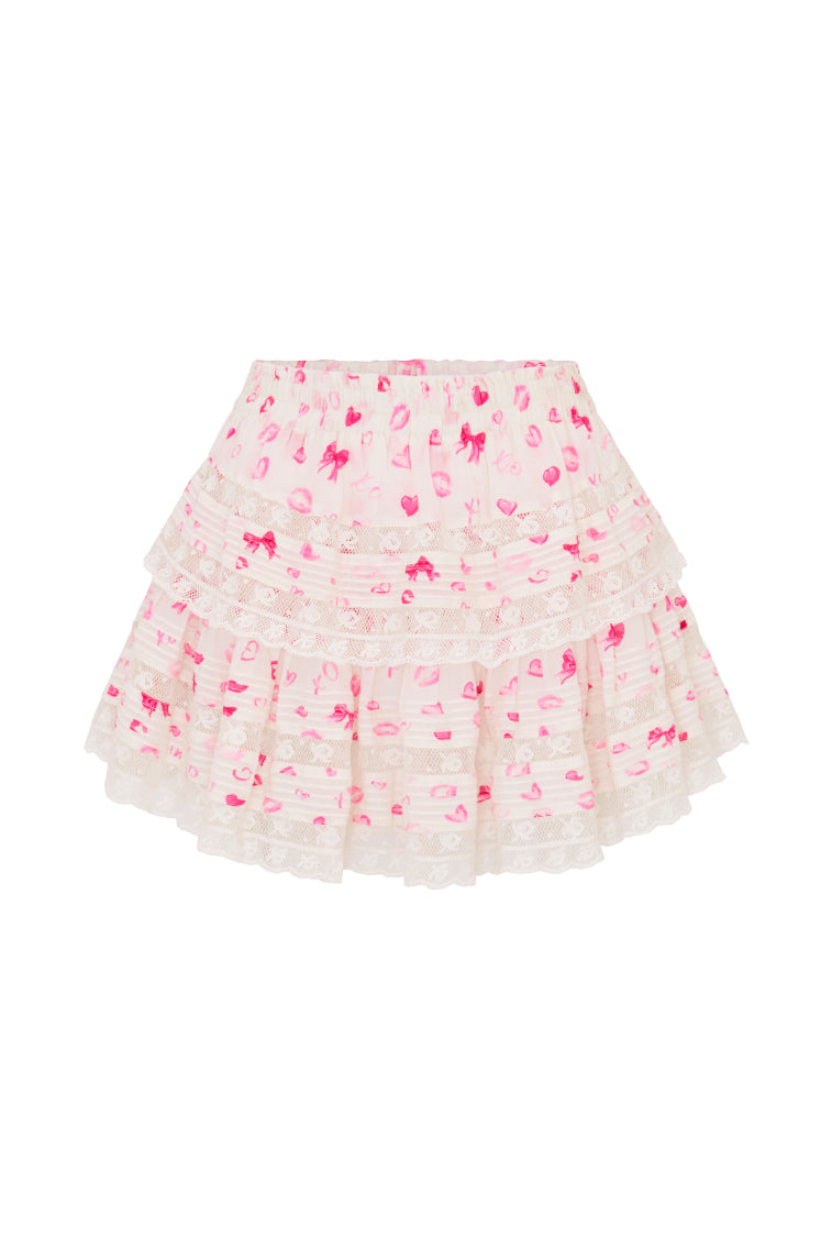Our best-selling Ruffle Mini Skirt returns for Valentine's Day with our new playful Bisous Bisous print with bows. hearts. and everything pretty in pink. She features intricate inset lace trims and allover pintuck details. The elasticated waistband offers flexibility in comfort and styling. Tiered ruffles exude effortless femininity. The mini is finished with a frayed. raw hem for added playfulness.