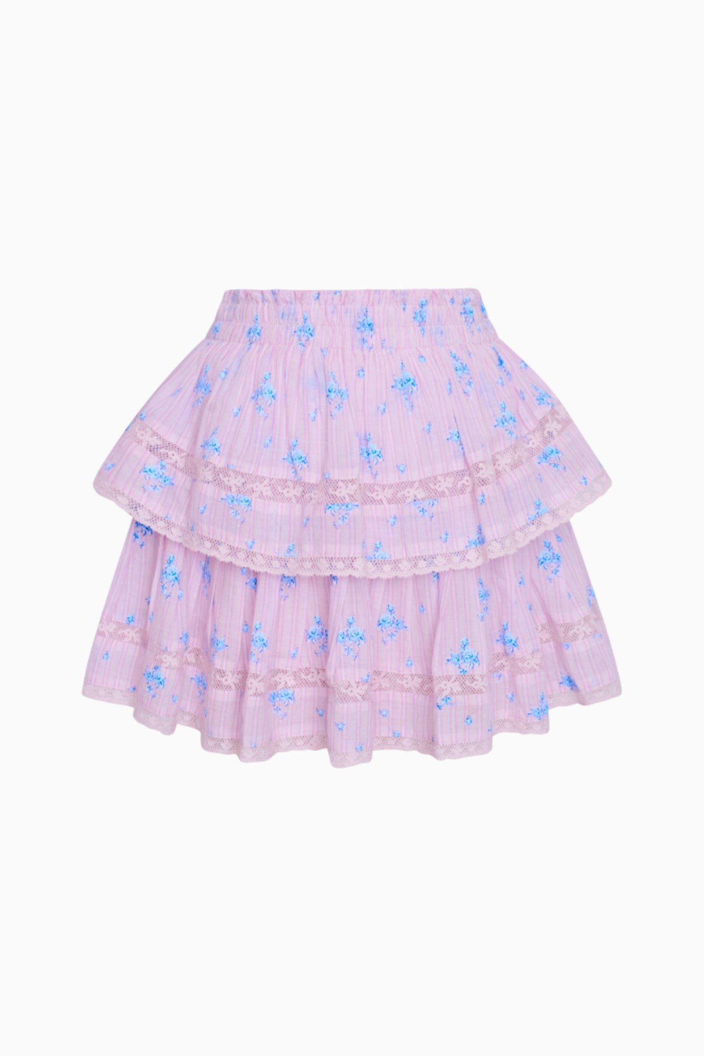 Our best-selling Ruffle Mini Skirt returns with a striped cotton voile fabric featuring a ditsy floral print all over. She features intricate inset lace trims and allover pintuck details. The elasticated waistband offers flexibility in comfort and styling. Tiered ruffles exude effortless femininity. The mini is finished with a frayed. raw hem for added playfulness.
