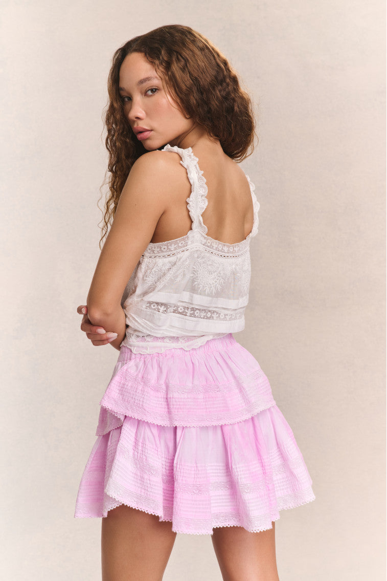 Our best selling Ruffle Mini Skirt returns for the season. She features intricate inset lace trims and allover pintuck details. The elasticated waistband and double lining offers flexibility in comfort and styling. Tiered ruffles exude effortless femininity. The mini is finished with a frayed. raw hem for added playfulness. Complete the look with our Nora Top.