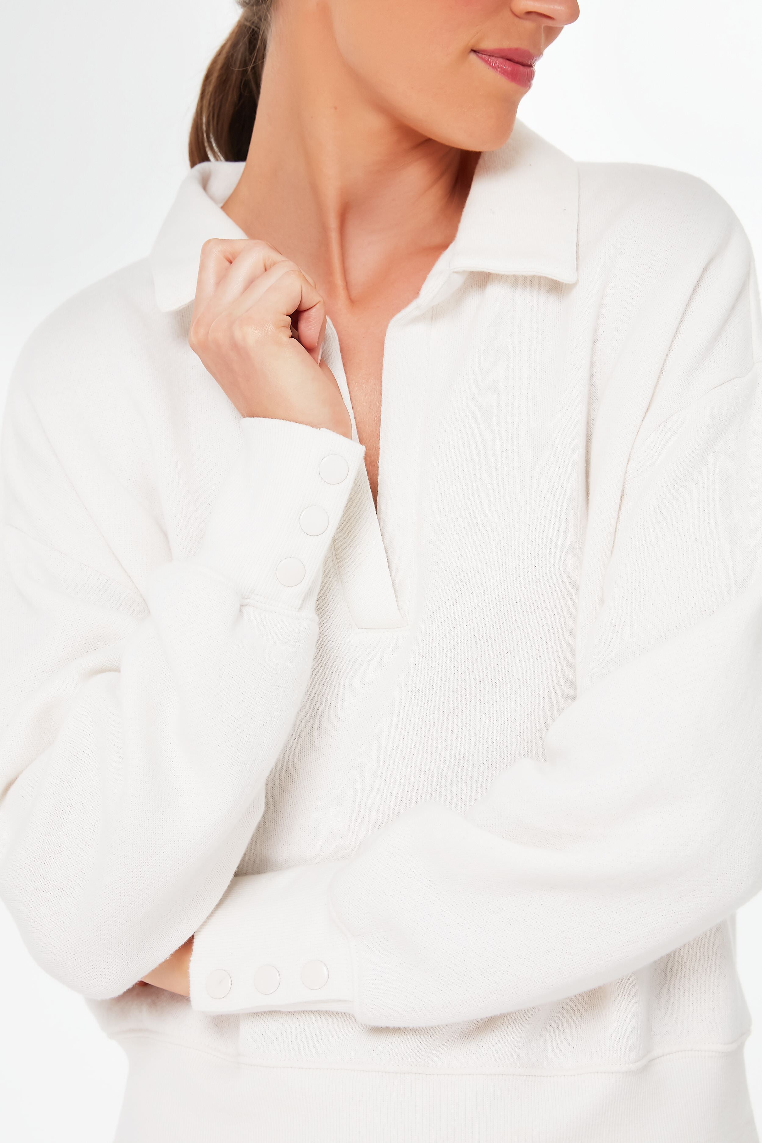 Who ever said loungewear can't be chic? Elevate your look while remaining comfy as ever in the Sandstone Maeve Top. A collared neckline brings the sophistication. while a relaxed fit and a fleeced fabric ensure you will never want to take this layer off. Bring a fresh look to this off-duty staple by pairing it with leggings and a tote for morning coffee runs. or try it with denim and cool-girl sneakers for weekend adventures.
